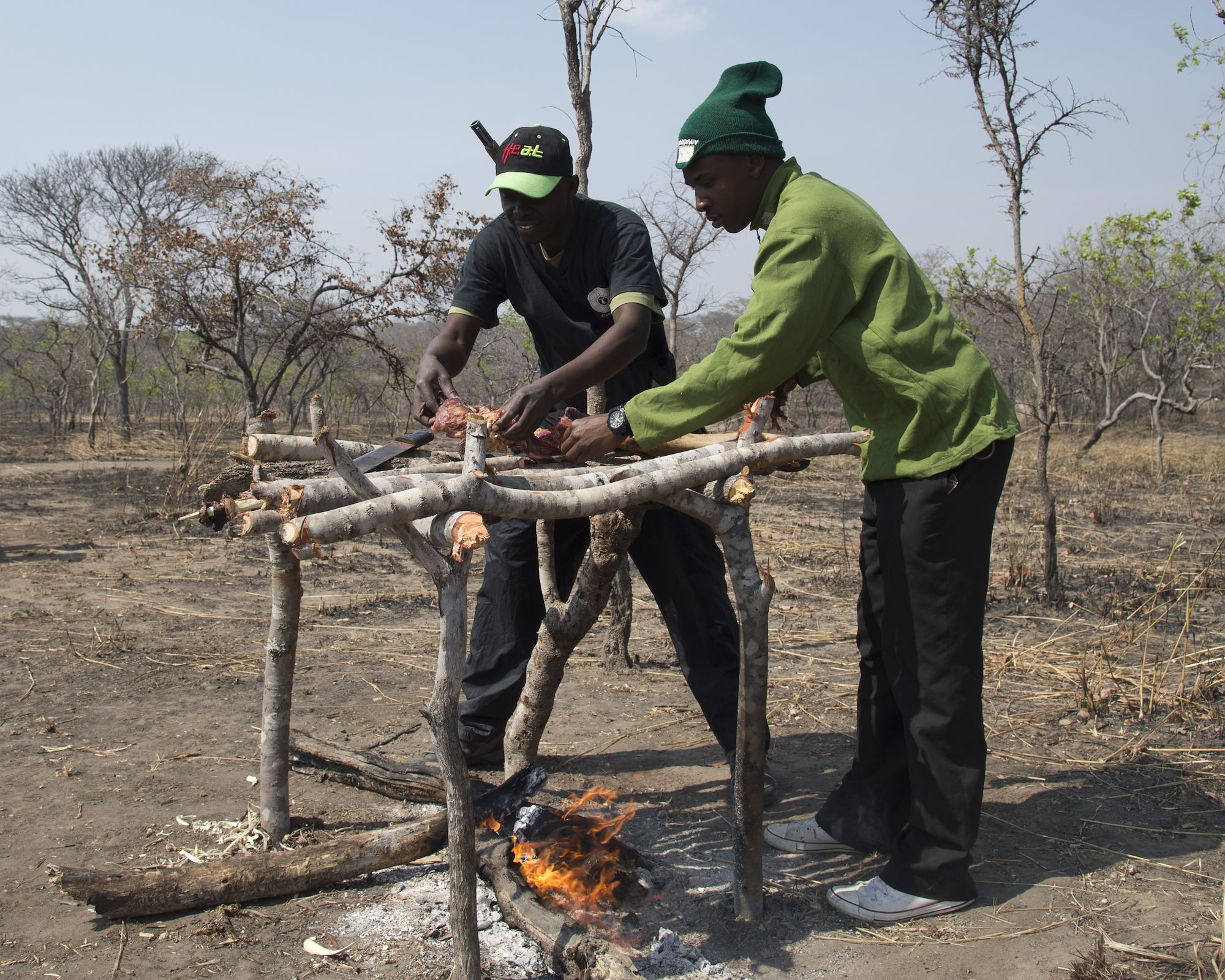 Tanzania park and game reserve rangers, acting as poachers, cook meat from a game reserve animal as part of demonstration August 24, 2016, at Rungwa Game Reserve, Tanzania. The scenario was based around rangers locating a camp of poachers who illegally killed an elephant to harvest its ivory. Rangers recently trained with members of the 403rd Civil Affairs Battalion, a component of Combined Joint Task Force - Horn of Africa, and North Carolina Army National Guard to learn techniques to track and capture poachers. (U.S. Air Force photo by Staff Sgt. Eric Summers Jr.)