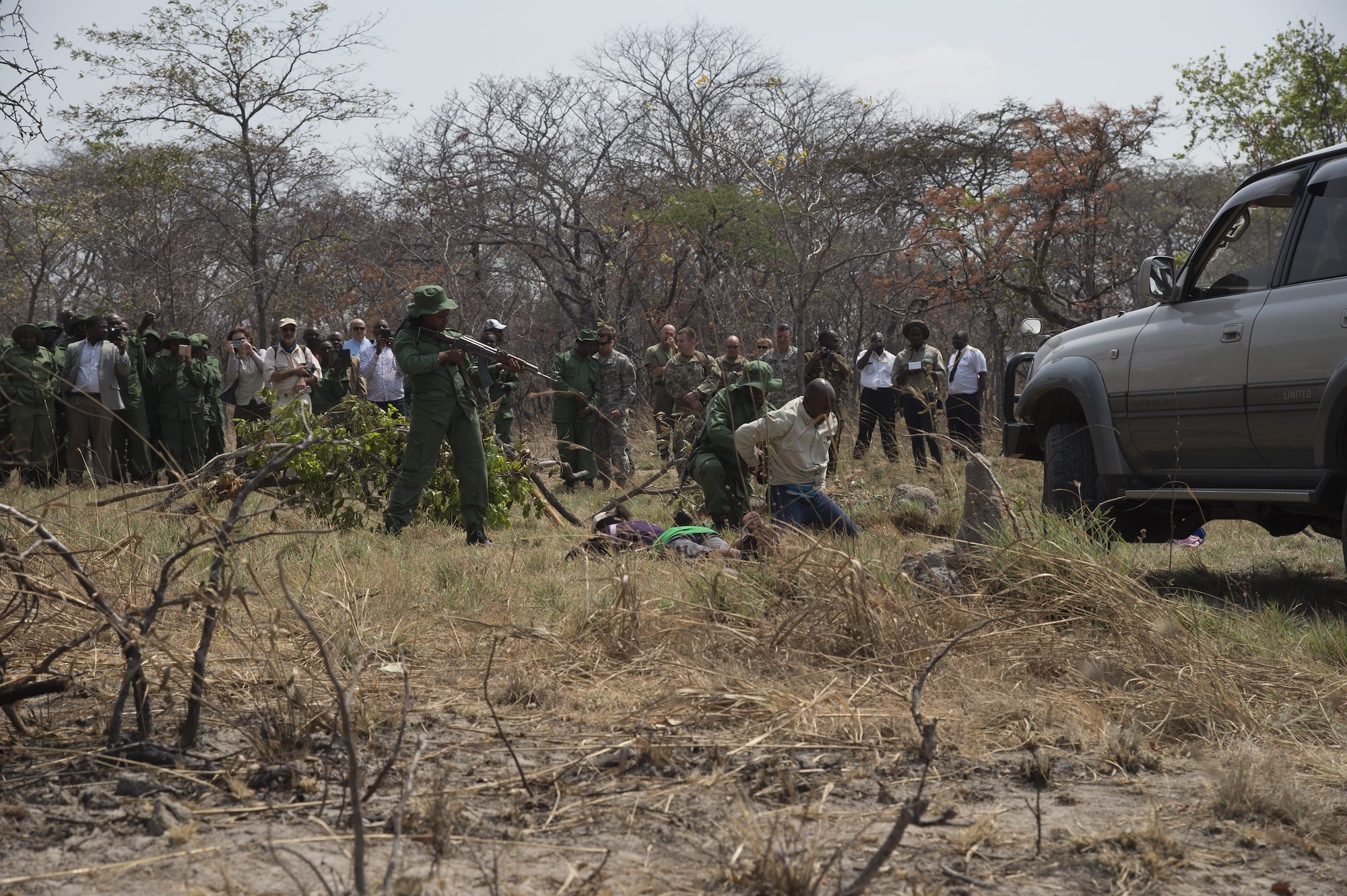 Tanzania park and game reserve rangers apprehend and search simulated poachers who tried to escape in a vehicle during a demonstration August 24, 2016, at the Rungwa Game Reserve, Tanzania. Rangers recently trained with members of the 403rd Civil Affairs Battalion, a component of Combined Joint Task Force - Horn of Africa, and North Carolina Army National Guard to learn techniques to track and capture poachers. (U.S. Air Force photos by Staff Sgt. Eric Summers Jr.)