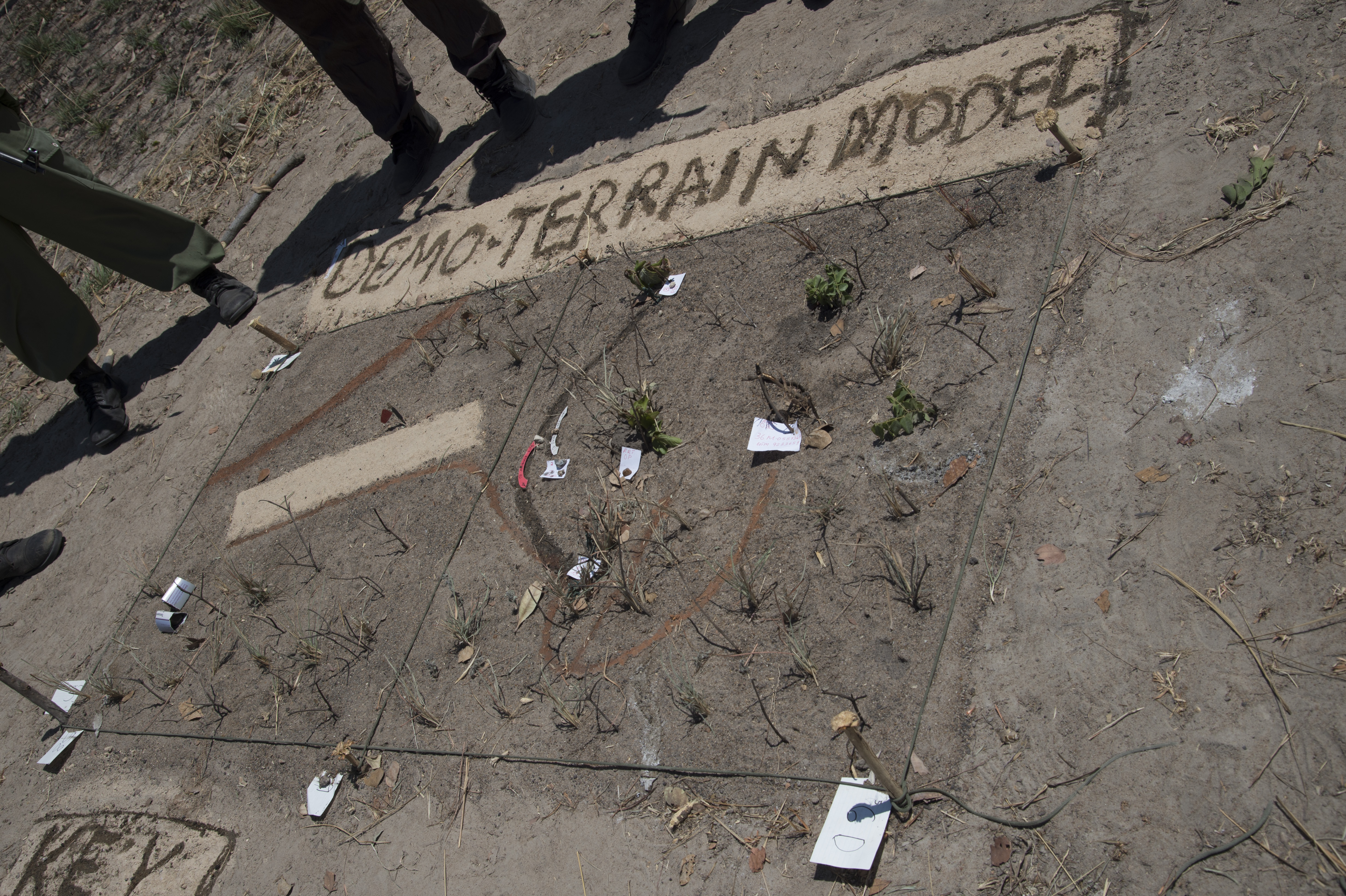 Tanzania rangers use a terrain model depicting the poacher camp in relation to friendly unit forces to coordinate an attack during an anti-poaching demonstration Aug. 24, 2016, at the Rungwa Game Reserve, Tanzania. Rangers recently trained with members of the 403rd Civil Affairs Battalion, a component of Combined Joint Task Force - Horn of Africa, and North Carolina Army National Guard to learn techniques to track and capture poachers. (U.S. Air Force photo by Staff Sgt. Eric Summers Jr.)