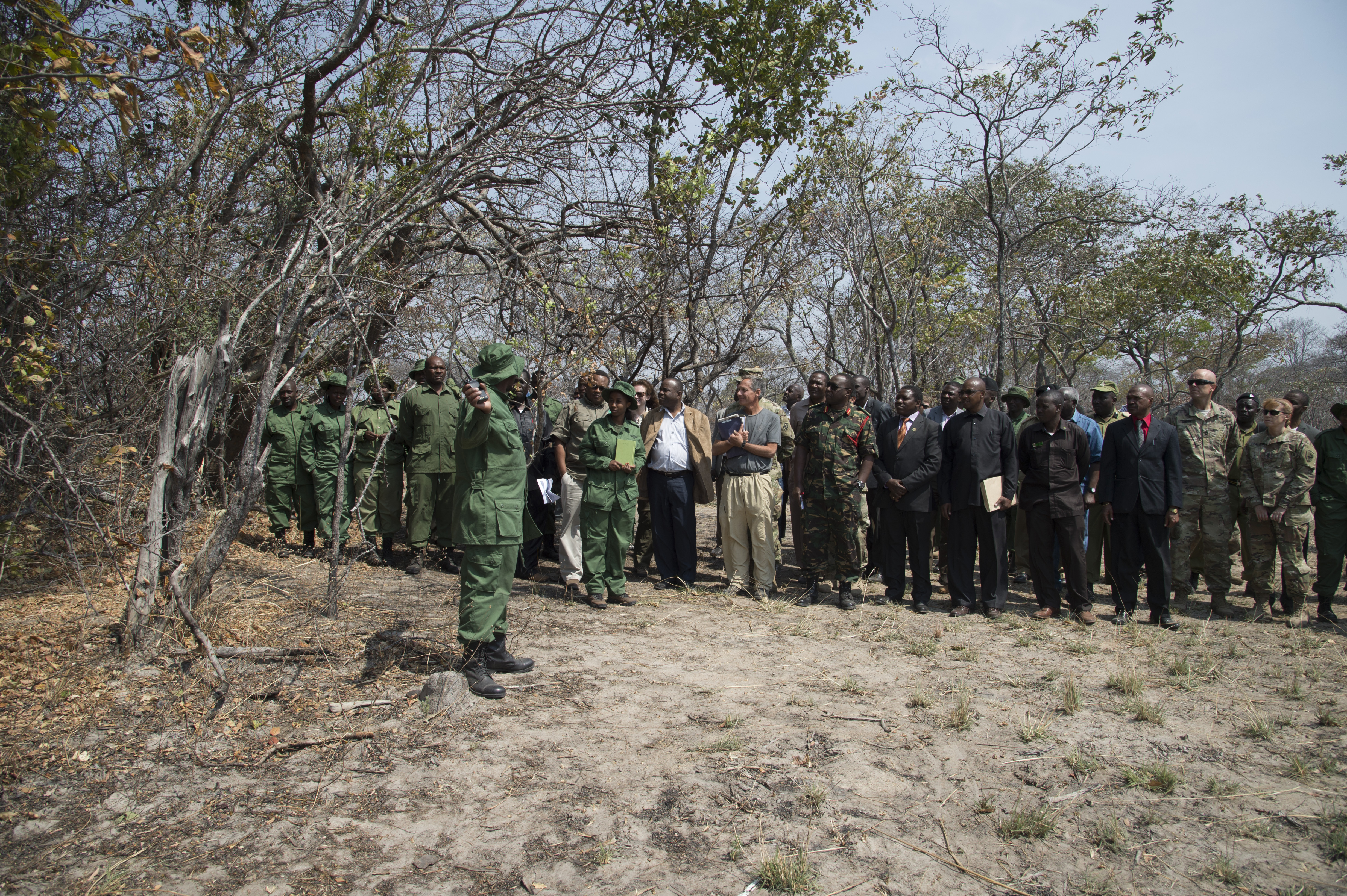 Spectators from the Ministry of Natural Resources and Tourism, Combined Joint Task Force - Horn of Africa, U.S. Embassy Tanzania and North Carolina Army National Guard listen to a briefing before witnessing the raid of a simulated poacher camp August 24, 2016, at the Rungwa Game Reserve, Tanzania. Tanzania rangers recently trained with members of the 403rd Civil Affairs Battalion, a component of Combined Joint Task Force - Horn of Africa, and North Carolina Army National Guard to learn techniques to track and capture poachers. The training is part of the Tanzanian government and U.S. Embassy’s plan to reduce wildlife poaching in the country. (U.S. Air Force photo by Staff Sgt. Eric Summers Jr.)