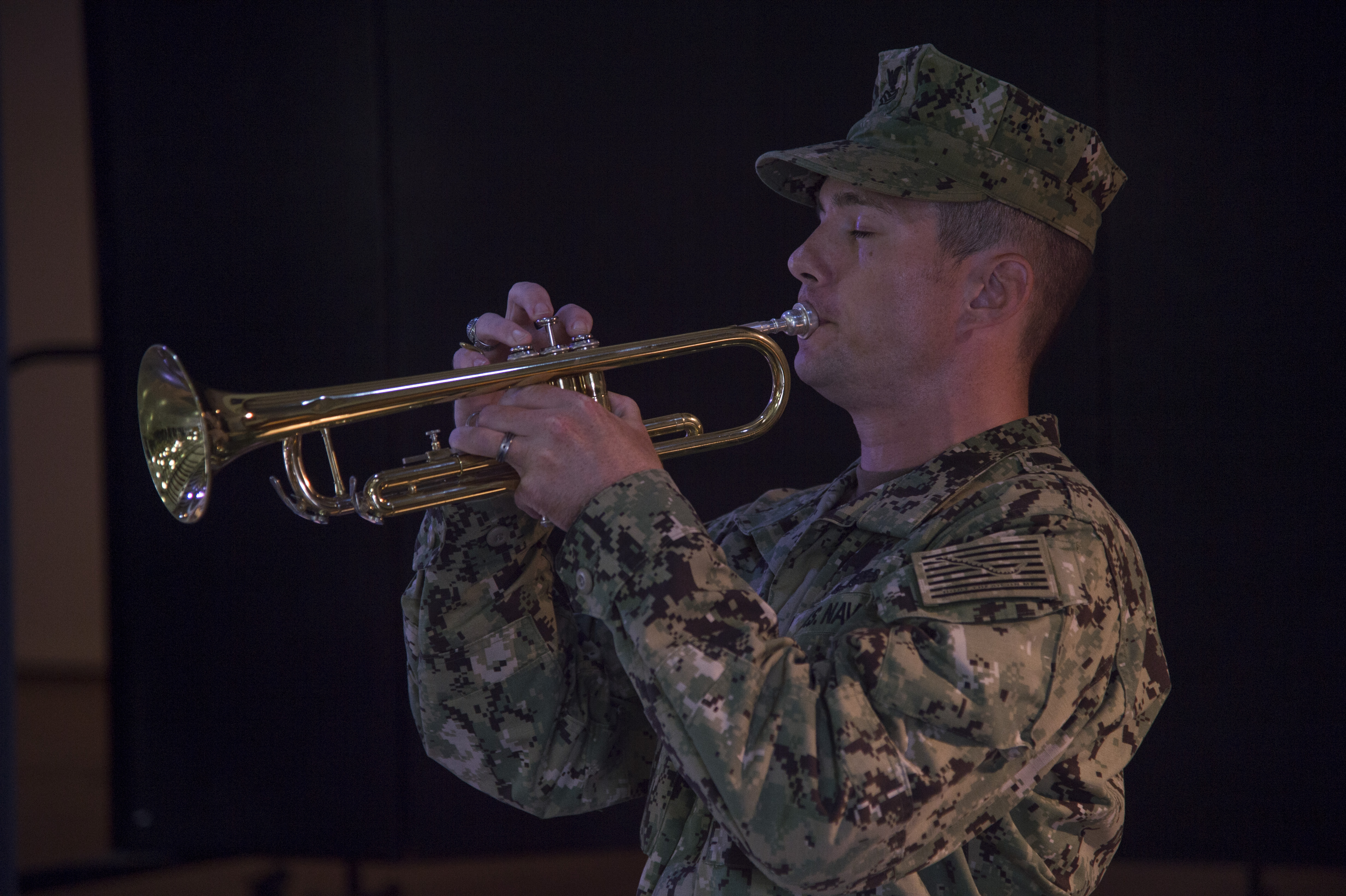 Chief Gunner’s Mate (Sel) Brian Ediger plays taps at the conclusion of a 9/11 remembrance ceremony held Sept. 11, 2016, at Camp Lemonnier, Djibouti. Taps in the military represents the end of a workday or time to rest. For the ceremony, it signaled the final rest for those who lost their lives during 9/11. The ceremony was organized and conducted by Fiscal Year 2017 Chief Petty Officer selectees from Camp Lemonnier and Combined Joint Task Force - Horn of Africa. (U.S. Air Force photo by Staff Sgt. Eric Summers Jr.)