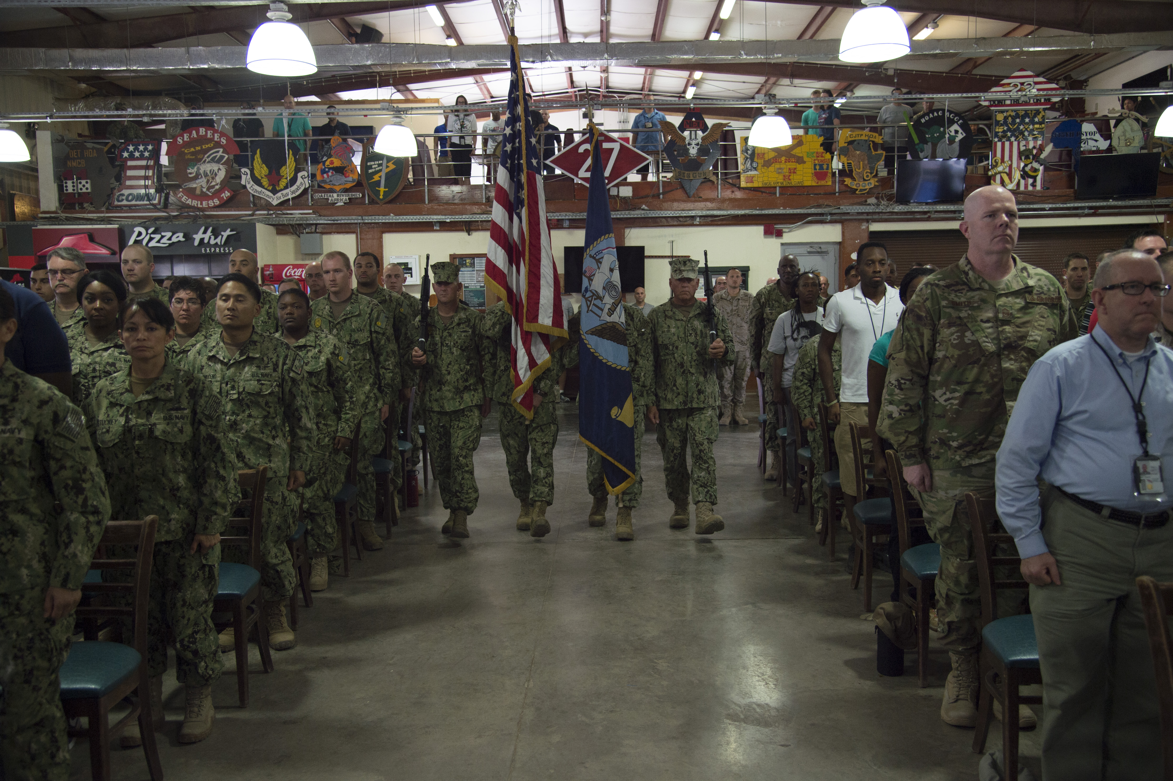 A color guard composed of U.S. Navy chief petty officer selectees presents the U.S. and Navy flags during a 9/11 remembrance ceremony held Sept. 11, 2016, at Camp Lemonnier, Djibouti. The ceremony was organized and conducted by Fiscal Year 2017 Chief Petty Officer selectees from Camp Lemonnier and Combined Joint Task Force - Horn of Africa. (U.S. Air Force photo by Staff Sgt. Eric Summers Jr.)