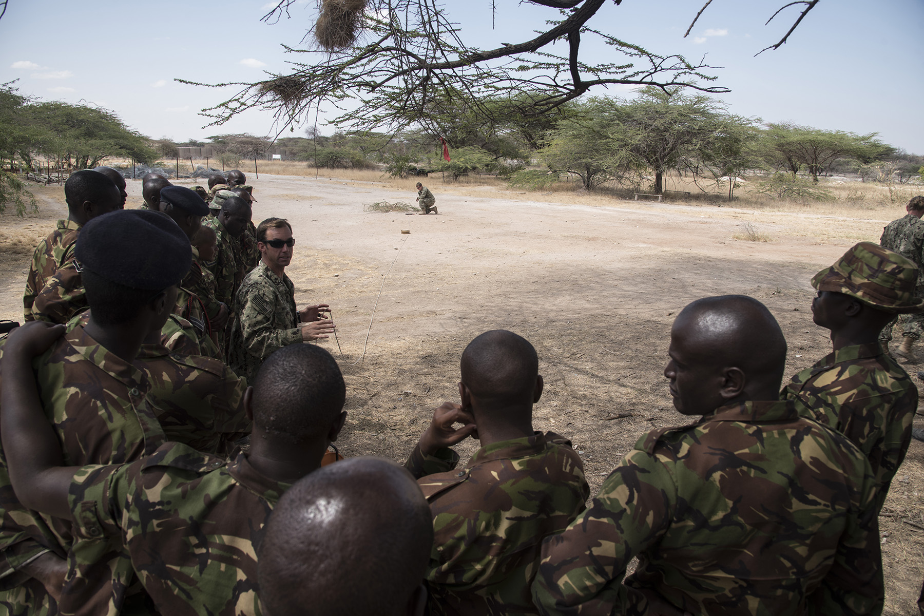 KENYA- U.S. Navy Chief Petty Officer Ryan Waller, assigned to Task Force Sparta and senior instructor for Deliberate Kindle 2016, demonstrates to Kenya Defense Forces combat engineers how to work around certain obstacles when an improvised explosive device is detected, as part of training during Deliberate Kindle 2016, Sept. 16, at a training center in Kenya. Deliberate Kindle is a four-week counter-improvised explosive device course designed to provide C-IED, medical, and train-the-trainer skills to approximately 53 KDF soldiers in preparation for future deployments with the African Union Mission in Somalia. (U.S. Air Force photo by Staff Sgt. Tiffany DeNault)