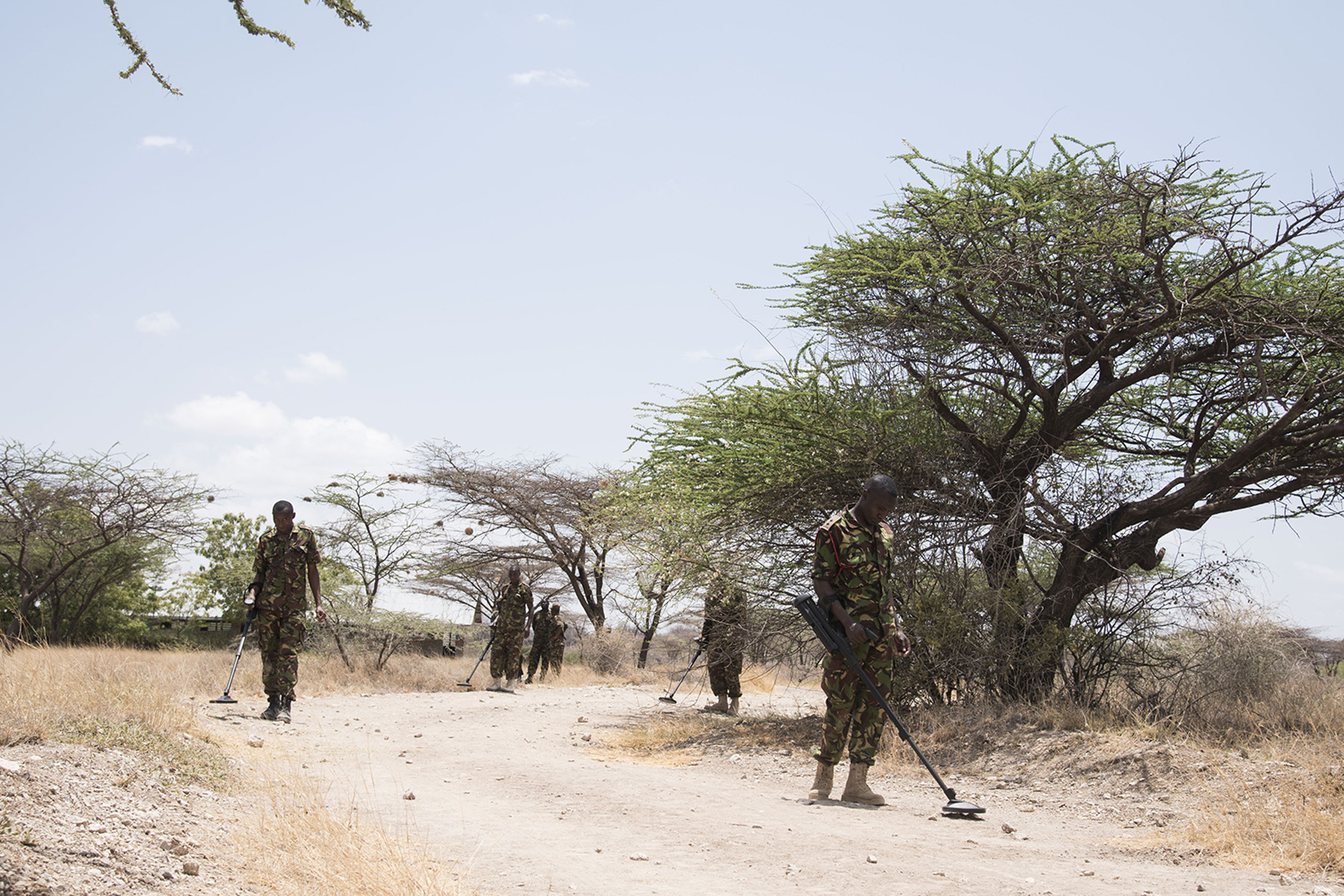 KENYA – Kenyan Defense Force combat engineers use mine detectors to scan the road for mock-improvised explosive devices during their final portion of tactical combat medical training during Deliberate Kindle 2016, Sept. 15, at a Kenyan training facility. The medical training was just one portion of the four-week course taught by Task Force Sparta, which is currently assigned to Combined Joint Task Force-Horn of Africa. The course was designed to give Humanitarian Mine Action training to course attendees to prepare them for future deployments with the African Union Mission in Somalia. (U.S. Air Force photo by Staff Sgt. Tiffany DeNault)