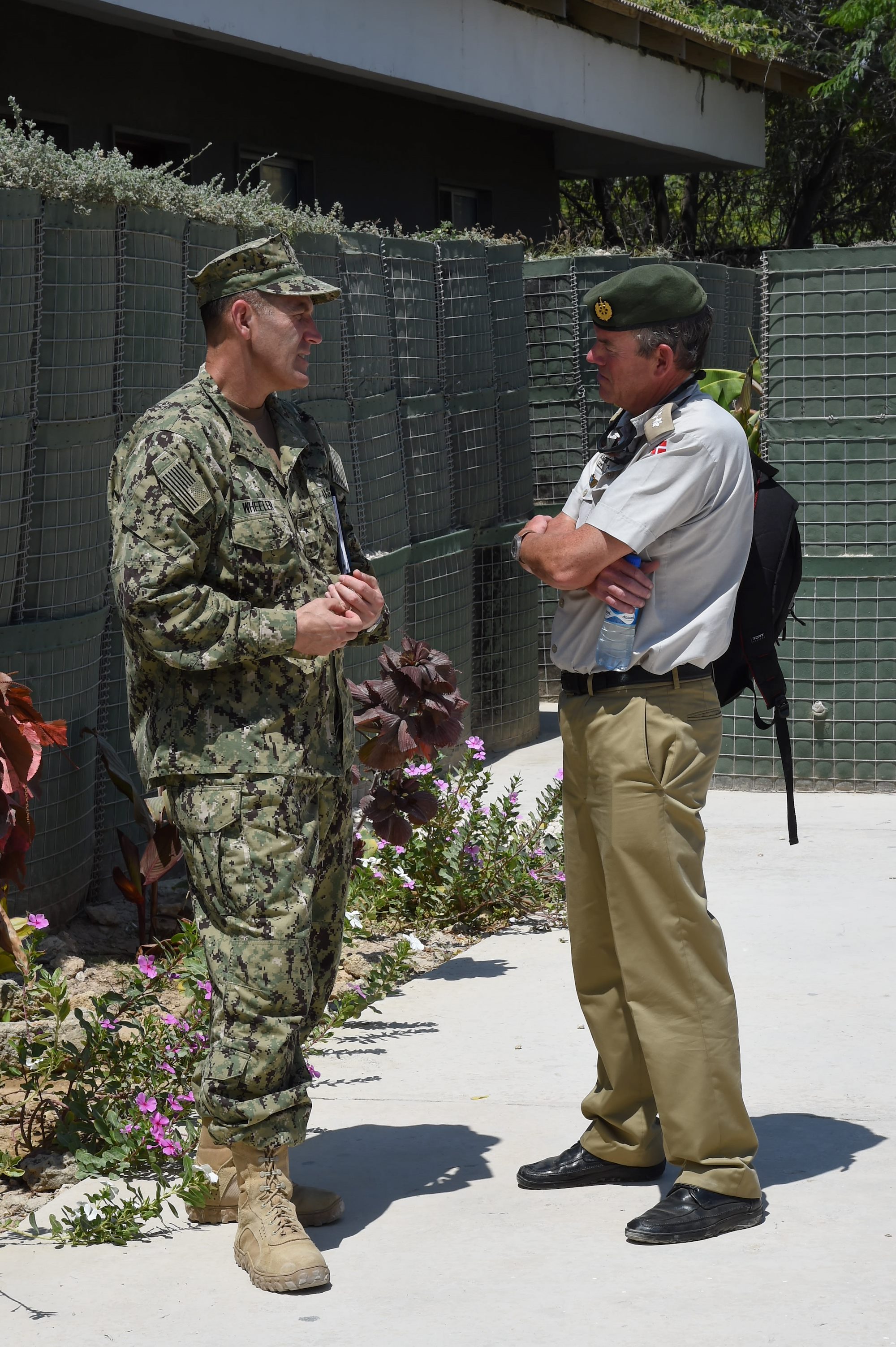 U.S. Navy Rear Adm. William Wheeler III, deputy commander of Combined Joint Task Force-Horn of Africa (CJTF-HOA), and Col. Søren Knudsen, Military Advisor to the Royal Danish Embassy and Defense Attaché Kenya, Nairobi, converse after a defense steering committee meeting, Nov. 3, 2016, in Mogadishu, Somalia. The venue allowed members to discuss Somalian defense security situations, AMISOM challenges, and the current dynamics seen by all sides. These meetings align with the CJTF-HOA mission of supporting and enabling the stabilization of Somalia. (U.S. Air Force photo by Staff Sgt. Penny Snoozy)