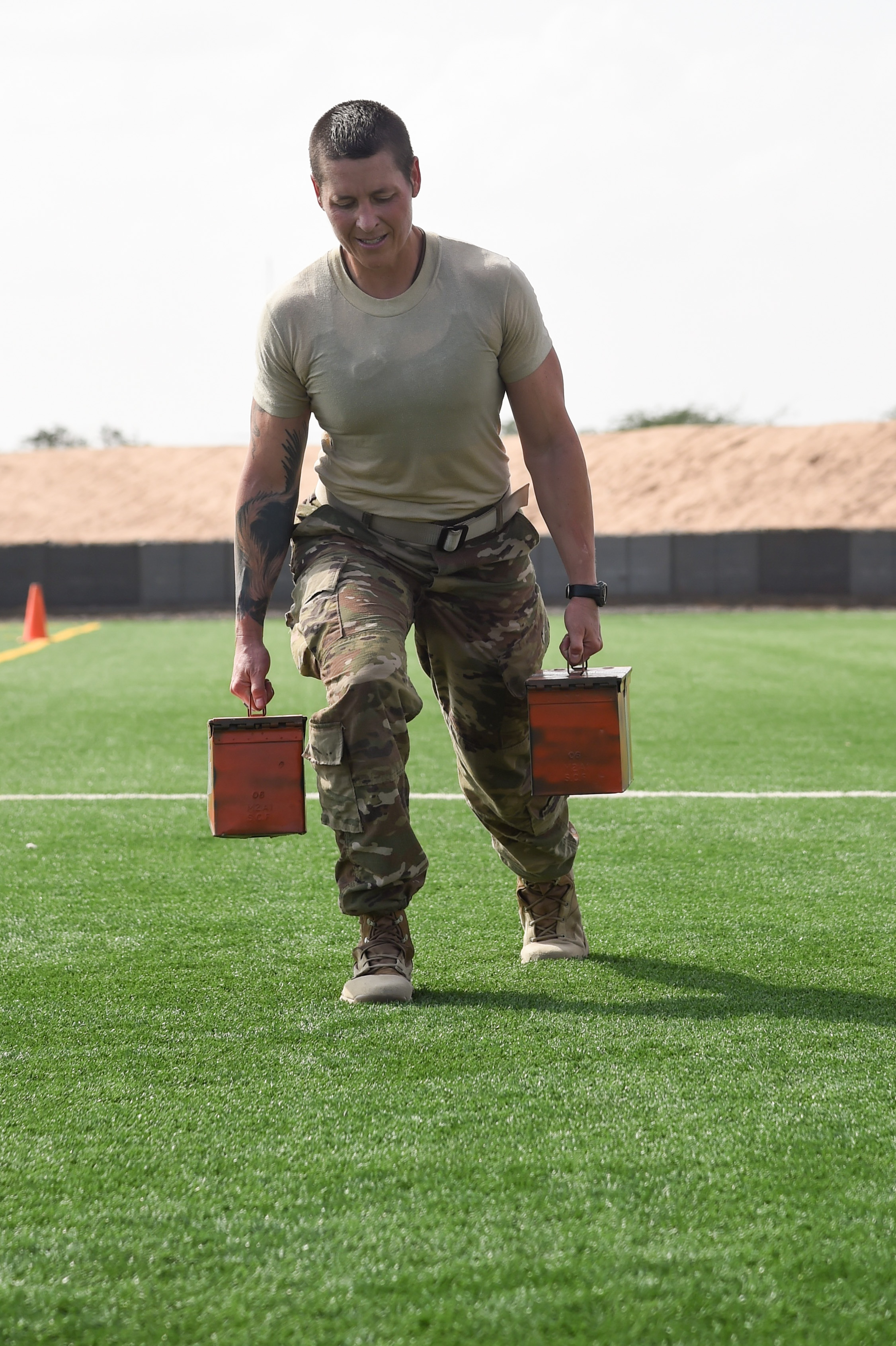 U.S. Army Staff Sgt. Hannah Mabel, Combined Joint Task Force-Horn of Africa, lunges 50 meters with ammo cans during the Joint Warrior Competition, Nov. 19, 2016, Camp Lemonnier, Djibouti. After the joint physical fitness test, participants started the joint combat fitness test. The combat test was comprised of a low crawl, tourniquet application, buddy carry, radio medical evacuation, grenade toss, tire flip, ammo can carry, dead lift, and rope climb. (U.S. Air National Guard photo by Staff Sgt. Penny Snoozy)