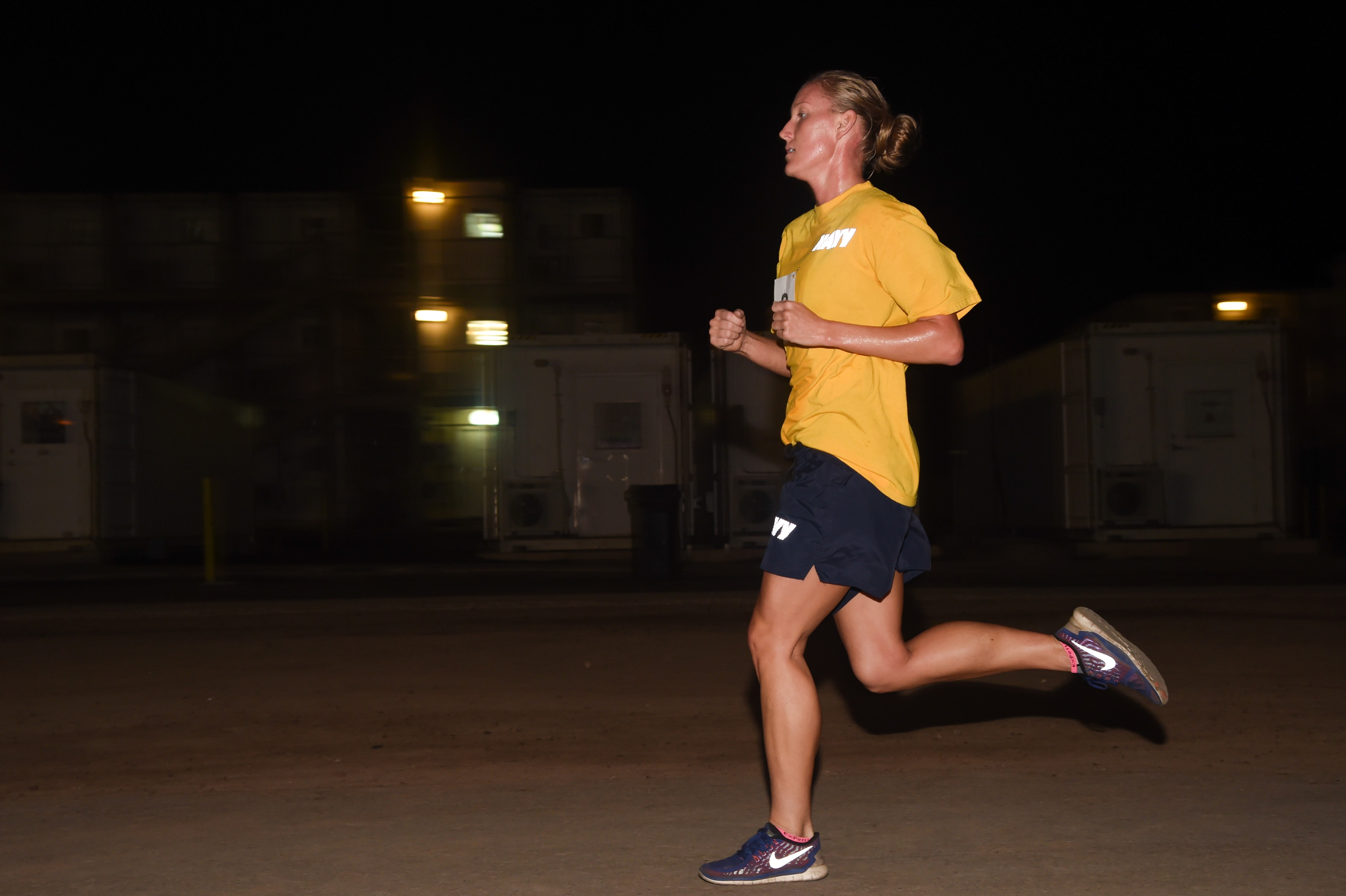 U.S. Navy Lt. j.g. Christina Hammervold, Task Force Sparta platoon commander, sprints her two-mile run graded to Army standards during the Joint Warrior Competition, Nov. 19, 2016, Camp Lemonnier, Djibouti. The run began after participants had already completed pull-ups, sit-ups, and push-ups. Members involved in the event met on the turf field at 3:30 a.m. to begin the day of events. (U.S. Air National Guard photo by Staff Sgt. Penny Snoozy)