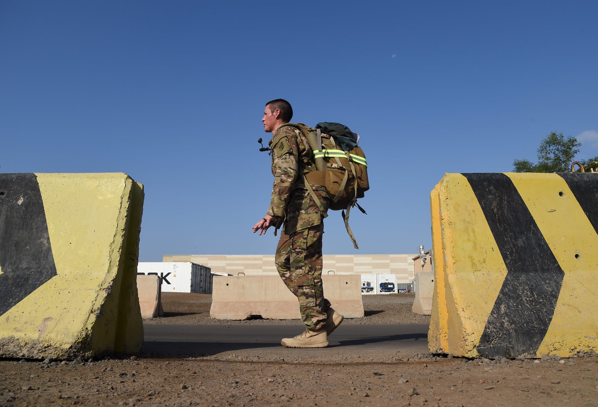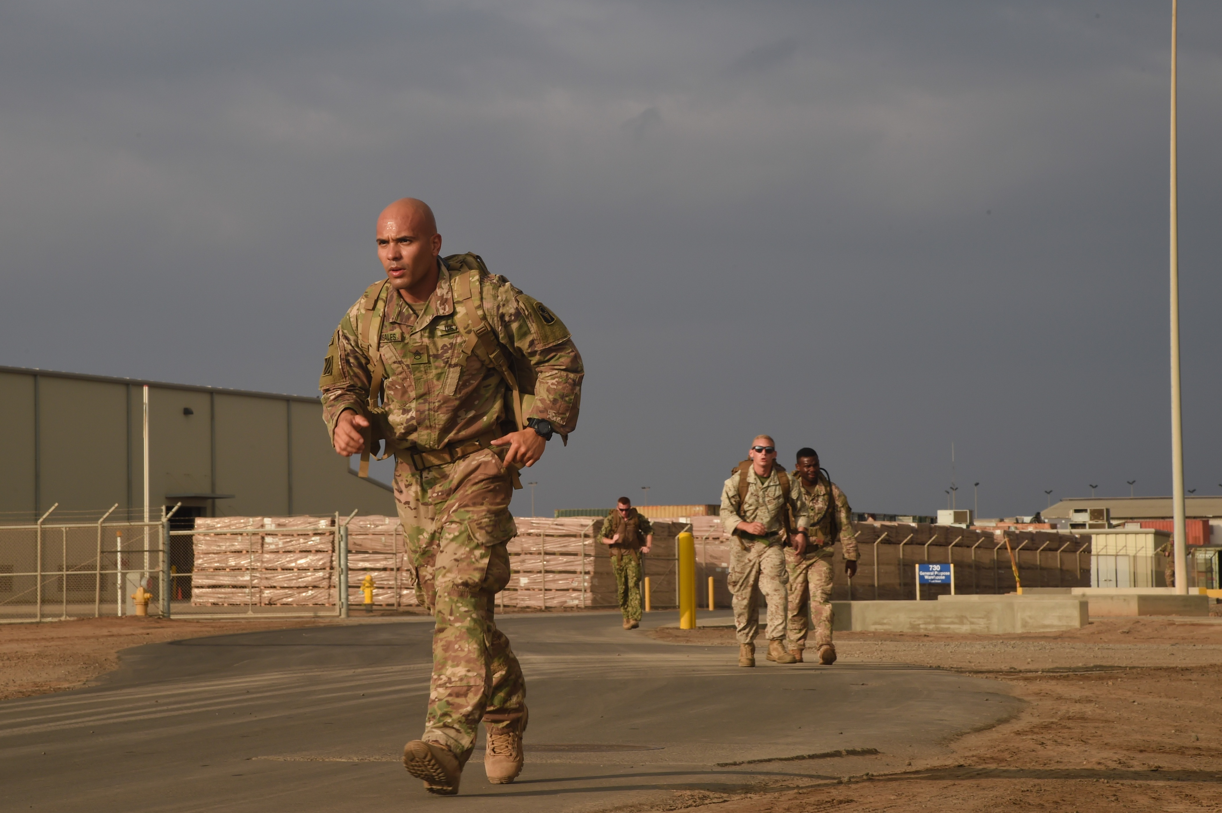 U.S. Army Staff Sgt. Juan Grisales, Combined Joint Task Force-Horn of Africa, endures a five-mile Army ruck march during the Joint Warrior Competition, Nov. 19, 2016, Camp Lemonnier, Djibouti. The ruck march began after participants had already completed a two-mile run, pull-ups, sit-ups, and push-ups. Members had to carry a minimum of 35 pounds during the march. (U.S. Air National Guard photo by Staff Sgt. Penny Snoozy)
