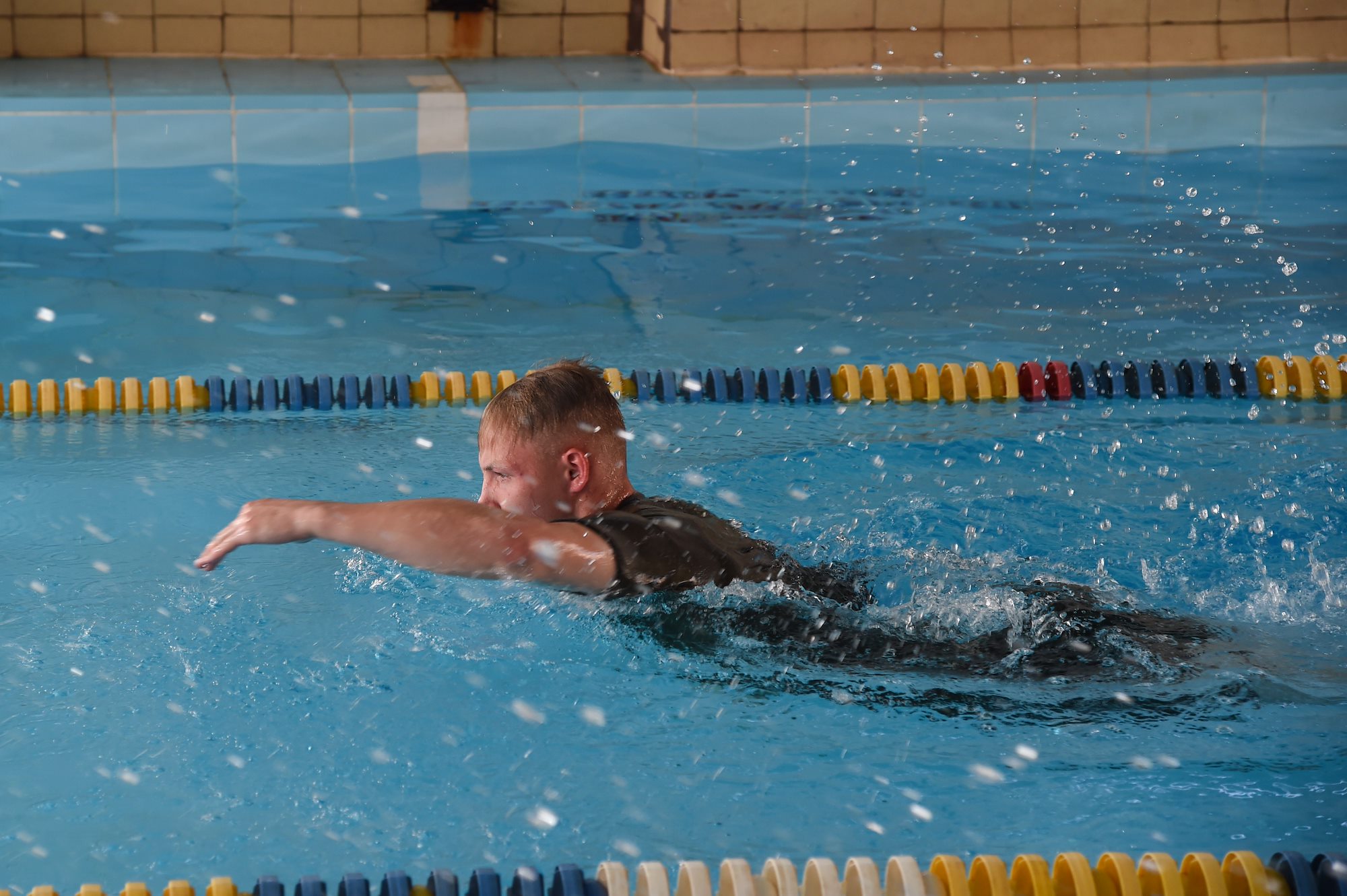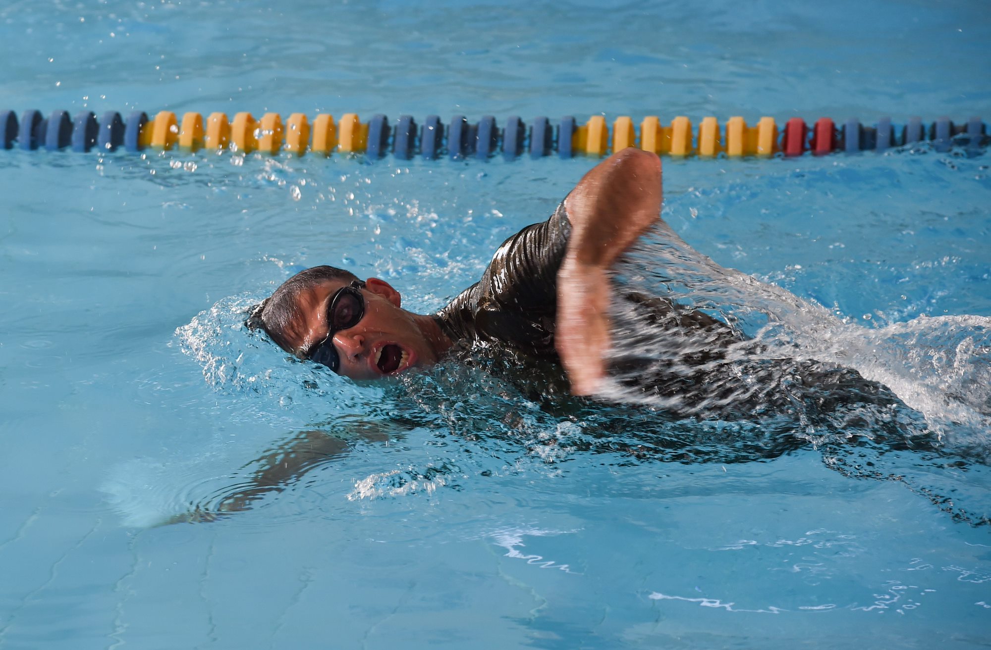 U.S. Marine Corps Cpl. Keifer Wilson, Special Purpose Marine Air-Ground Task Force 16.1/16.2, reaches for his next stroke during the 240-meter Navy swim test for the Joint Warrior Competition, Nov. 19, 2016, Camp Lemonnier, Djibouti. The swim test occurred after the joint physical fitness test and the joint combat fitness test. These two events were comprised of pull-ups, push-ups, sit-ups, two-mile run, five-mile ruck march, a low crawl, tourniquet application, buddy carry, radio medical evacuation, grenade toss, tire flip, ammo can carry, dead lift, and rope climb. (U.S. Air National Guard photo by Staff Sgt. Penny Snoozy)