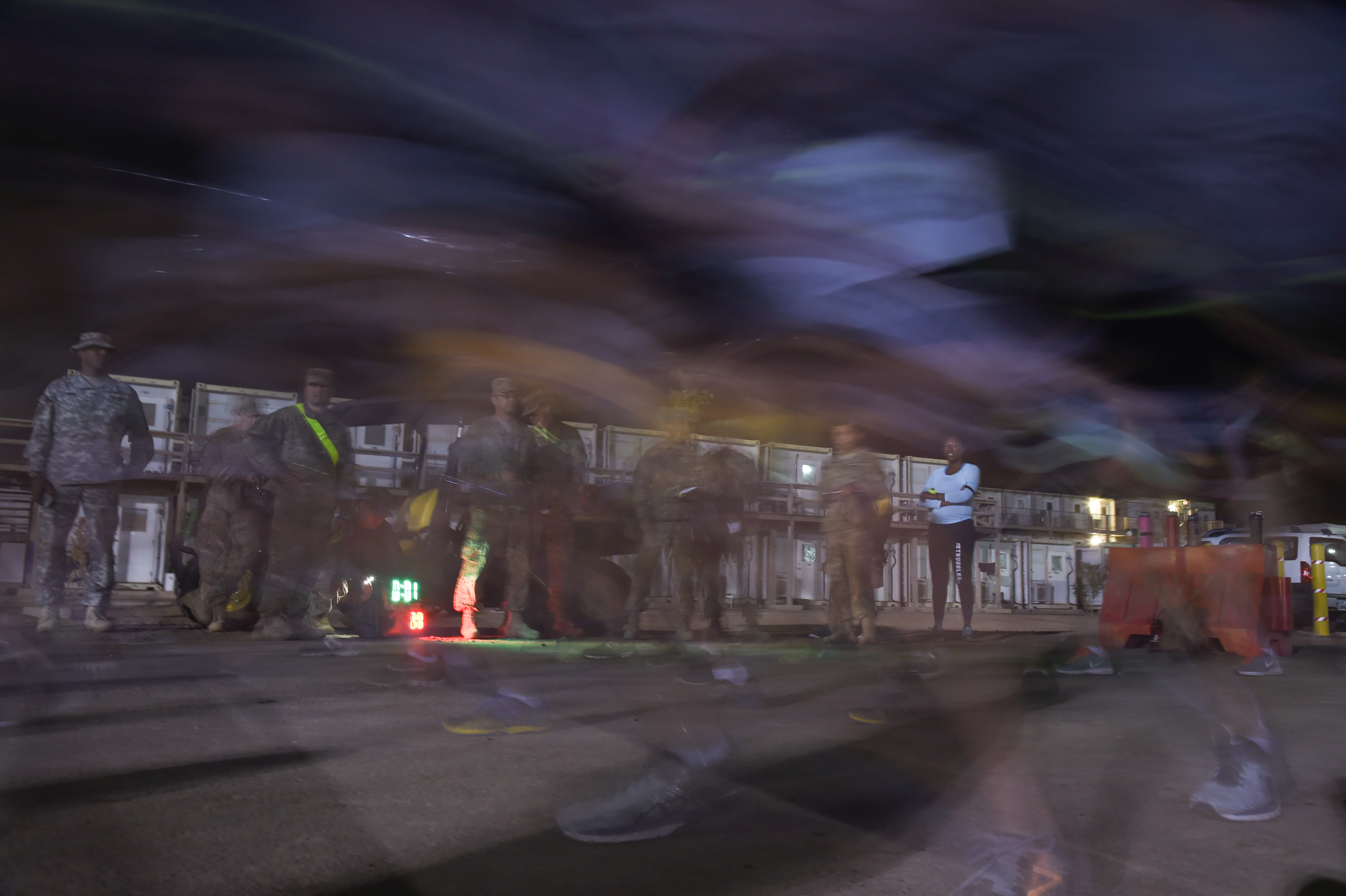 U.S. service members assigned to Combined Joint Task Force-Horn of Africa and Camp Lemonnier begin their two-mile run graded to Army standards during the Joint Warrior Competition, Nov. 19, 2016, Camp Lemonnier, Djibouti. The run began after participants had already completed pull-ups, sit-ups, and push-ups. Members involved in the event met on the turf field pre-dawn to begin the day of events. (U.S. Air National Guard photo by Staff Sgt. Penny Snoozy)