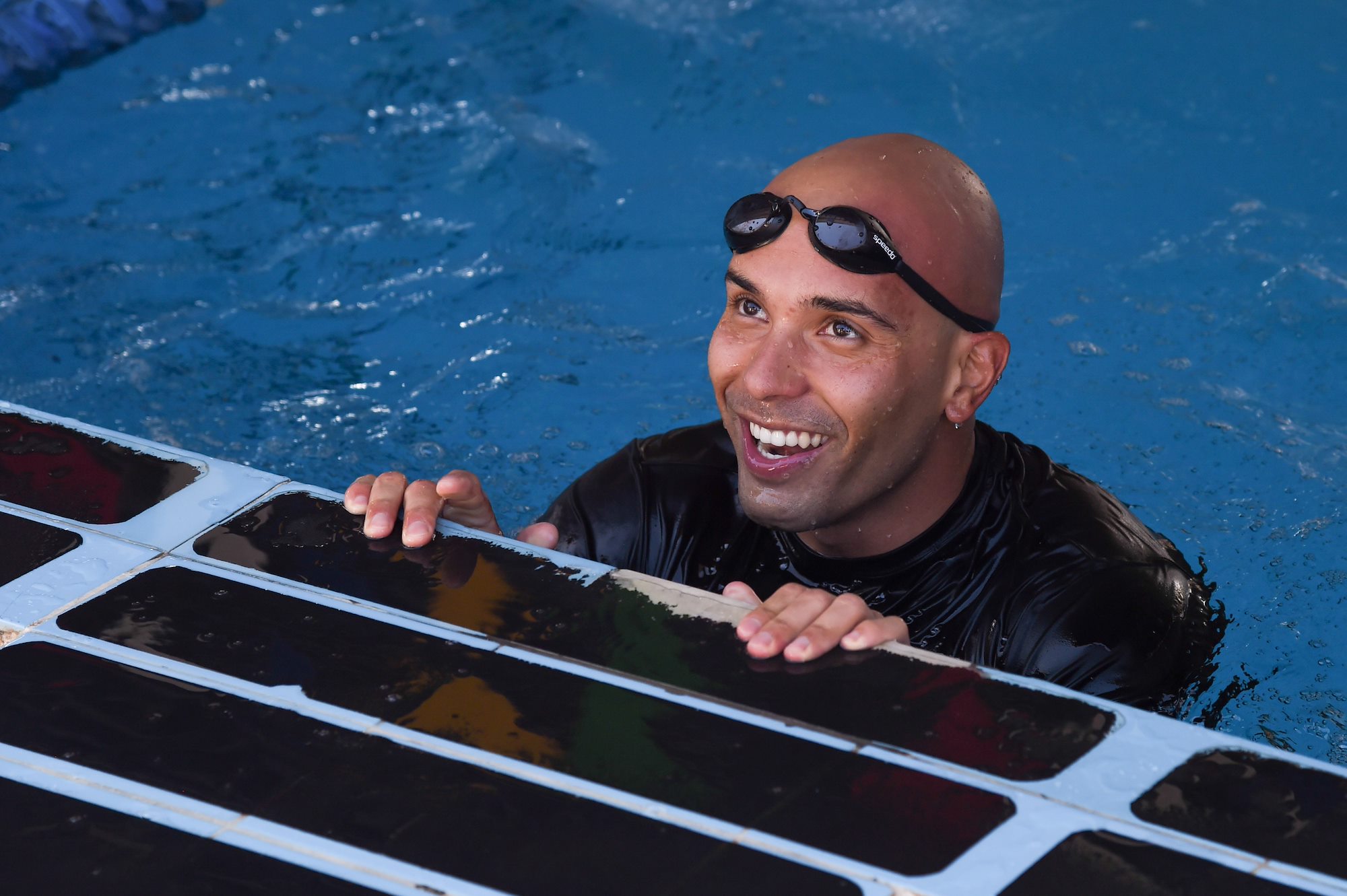 U.S. Army Staff Sgt. Juan Grisales, Combined Joint Task Force-Horn of Africa, completes the 240-meter Navy swim test during the Joint Warrior Competition, Nov. 19, 2016, Camp Lemonnier, Djibouti. The swim test occurred after the joint physical fitness test and the joint combat fitness test. These two events were comprised of pull-ups, push-ups, sit-ups, two-mile run, five-mile ruck march, a low crawl, tourniquet application, buddy carry, radio medical evacuation, grenade toss, tire flip, ammo can carry, dead lift, and rope climb. (U.S. Air National Guard photo by Staff Sgt. Penny Snoozy)