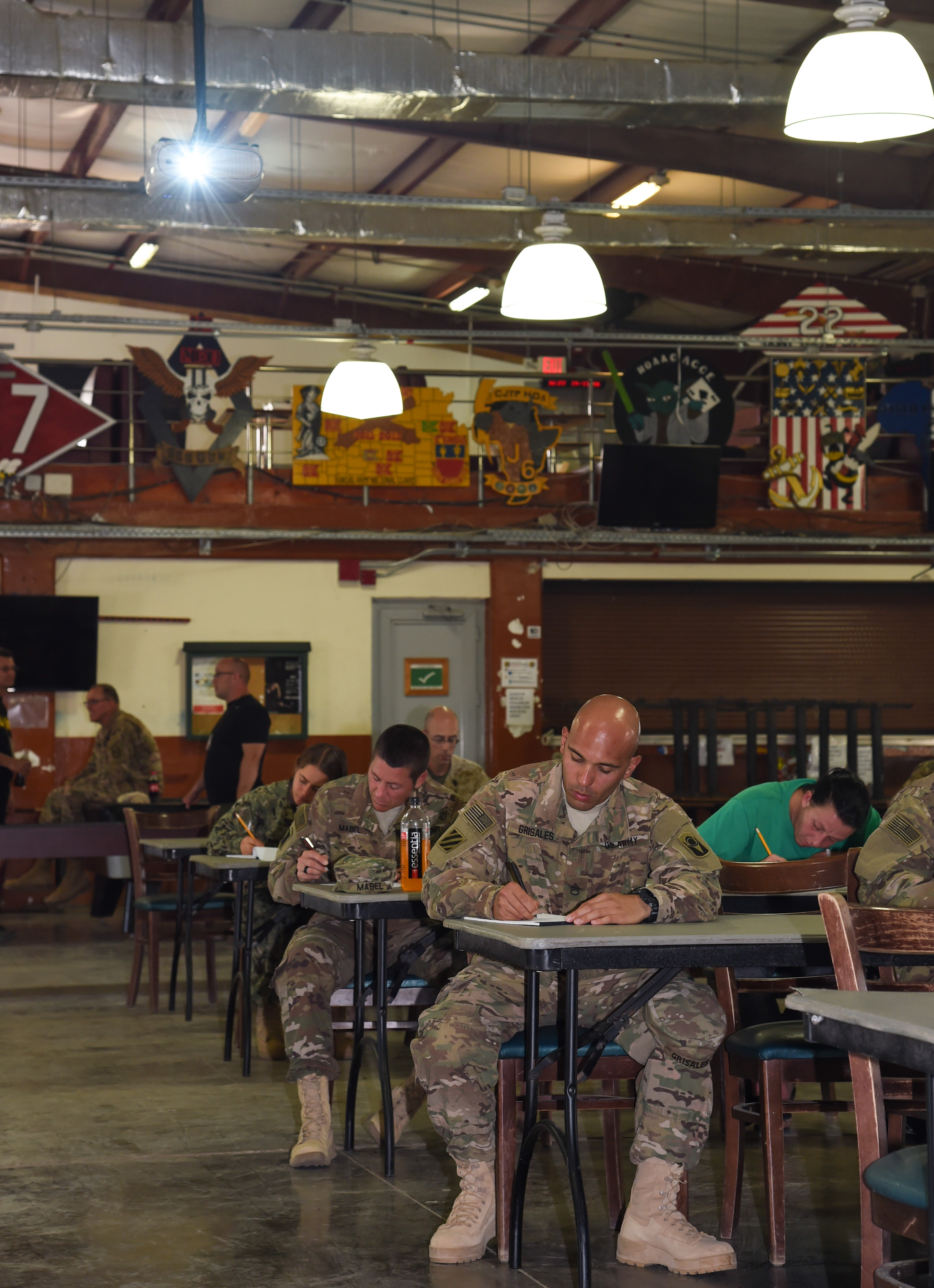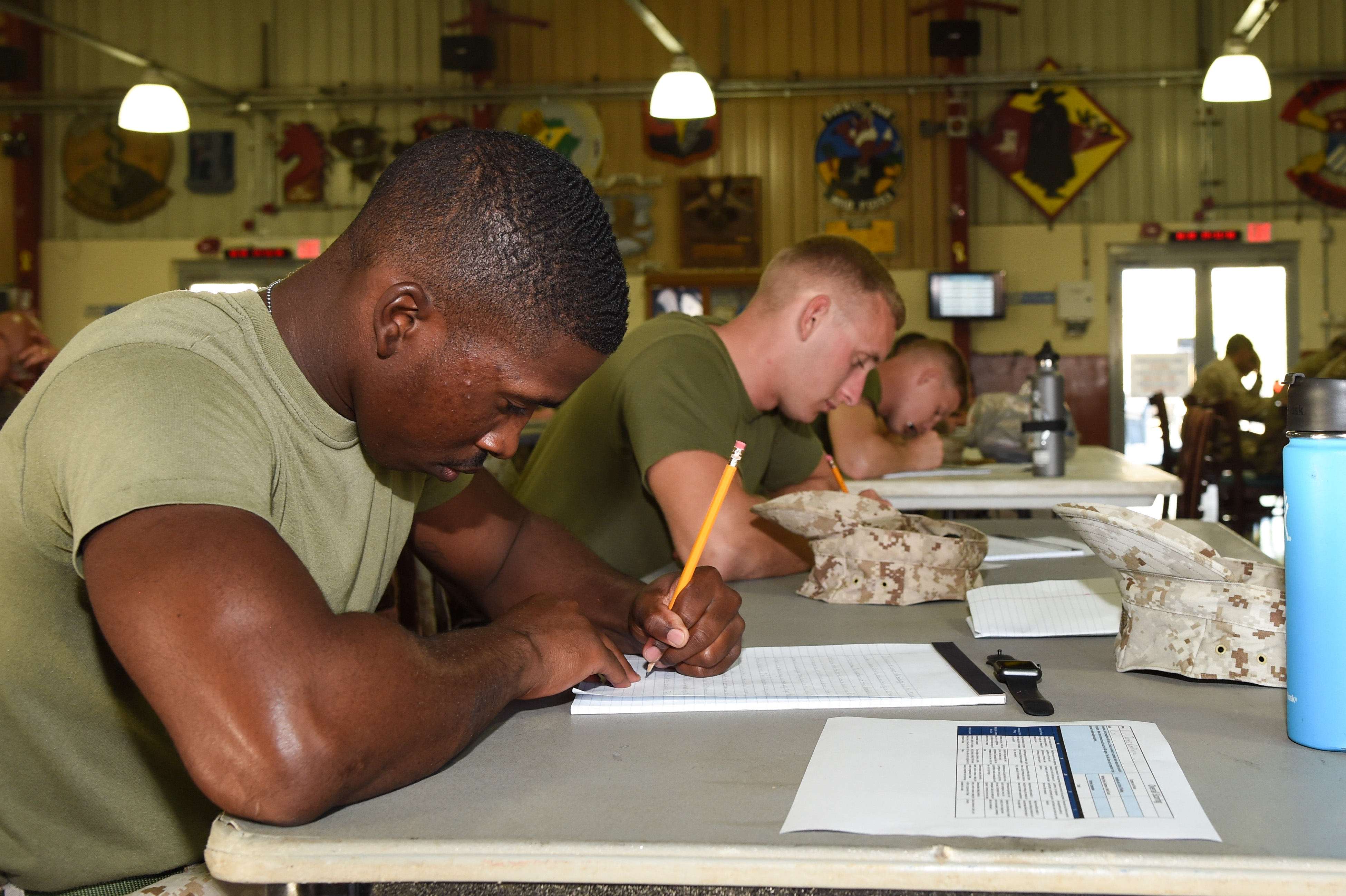 U.S. service members assigned to Combined Joint Task Force-Horn of Africa and Camp Lemonnier write essays during the final portion of the Joint Warrior Competition, Nov. 19, 2016, in Djibouti, Djibouti. Members were given one and a half hours to complete an essay with a minimum of 400 words. The essay was supposed to focus on the mission at Combined Joint Task Force-Horn of Africa and Camp Lemonnier’s strategic importance. (U.S. Air National Guard photo by Staff Sgt. Penny Snoozy)