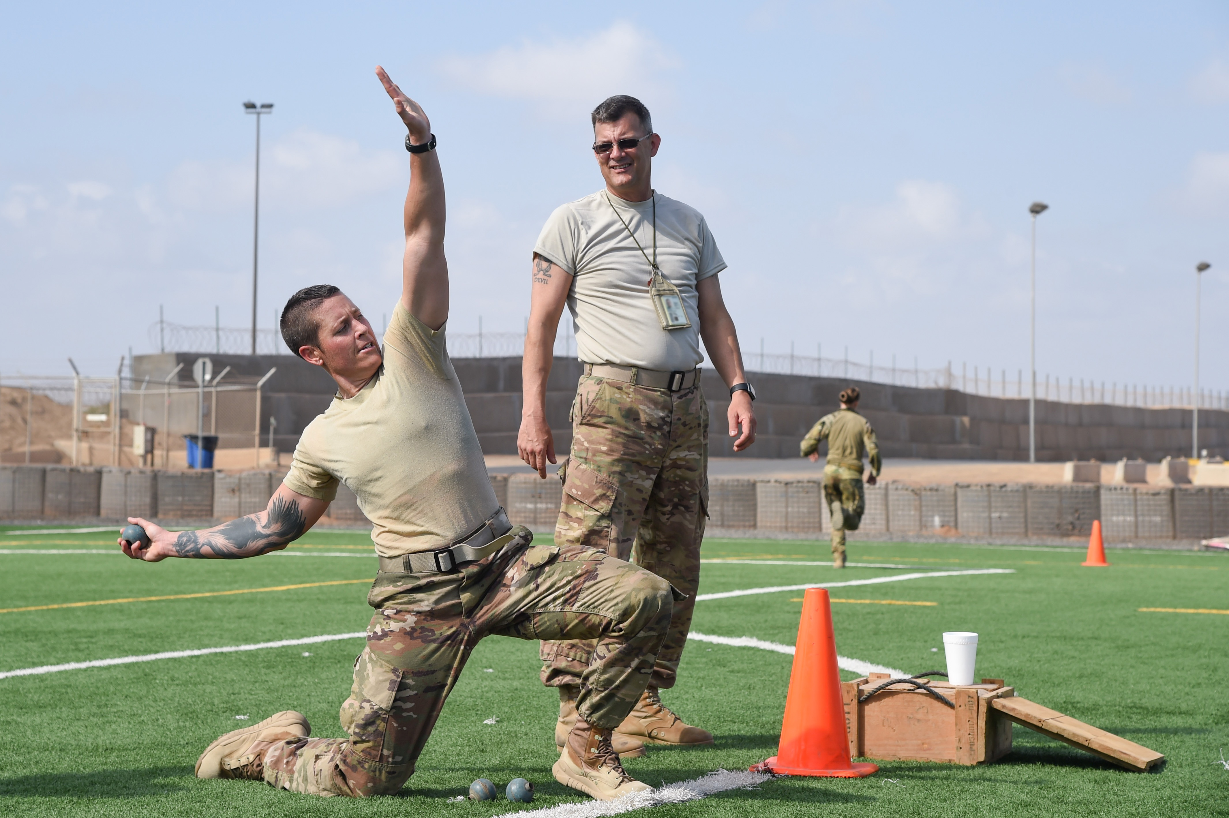 U.S. Army Staff Sgt. Hannah Mabel, Combined Joint Task Force-Horn of Africa, takes part in a grenade toss during the Joint Warrior Competition, Nov. 19, 2016, Camp Lemonnier, Djibouti. After the joint physical fitness test, participants started the joint combat fitness test. The combat test was comprised of a low crawl, tourniquet application, buddy carry, radio medical evacuation, grenade toss, tire flip, ammo can carry, dead lift, and rope climb. (U.S. Air National Guard photo by Staff Sgt. Penny Snoozy) (Portions of image blurred for security)