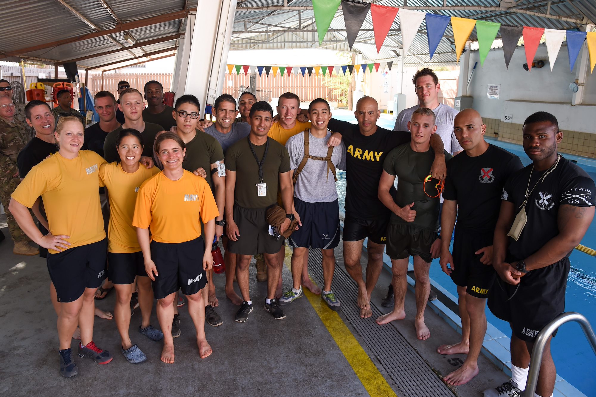 U.S. service members assigned to Combined Joint Task Force-Horn of Africa and Camp Lemonnier pose for a group photo after finishing the 240-meter Navy swim test for the Joint Warrior Competition, Nov. 19, 2016, Camp Lemonnier, Djibouti. Before the swim test, competitors completed a joint physical fitness test and a joint combat fitness test comprised of: pull-ups, push-ups, sit-ups, two-mile run, five-mile ruck march, a low crawl, tourniquet application, buddy carry, radio medical evacuation, grenade toss, tire flip, ammo can carry, dead lift, and rope climb. (U.S. Air National Guard photo by Staff Sgt. Penny Snoozy)