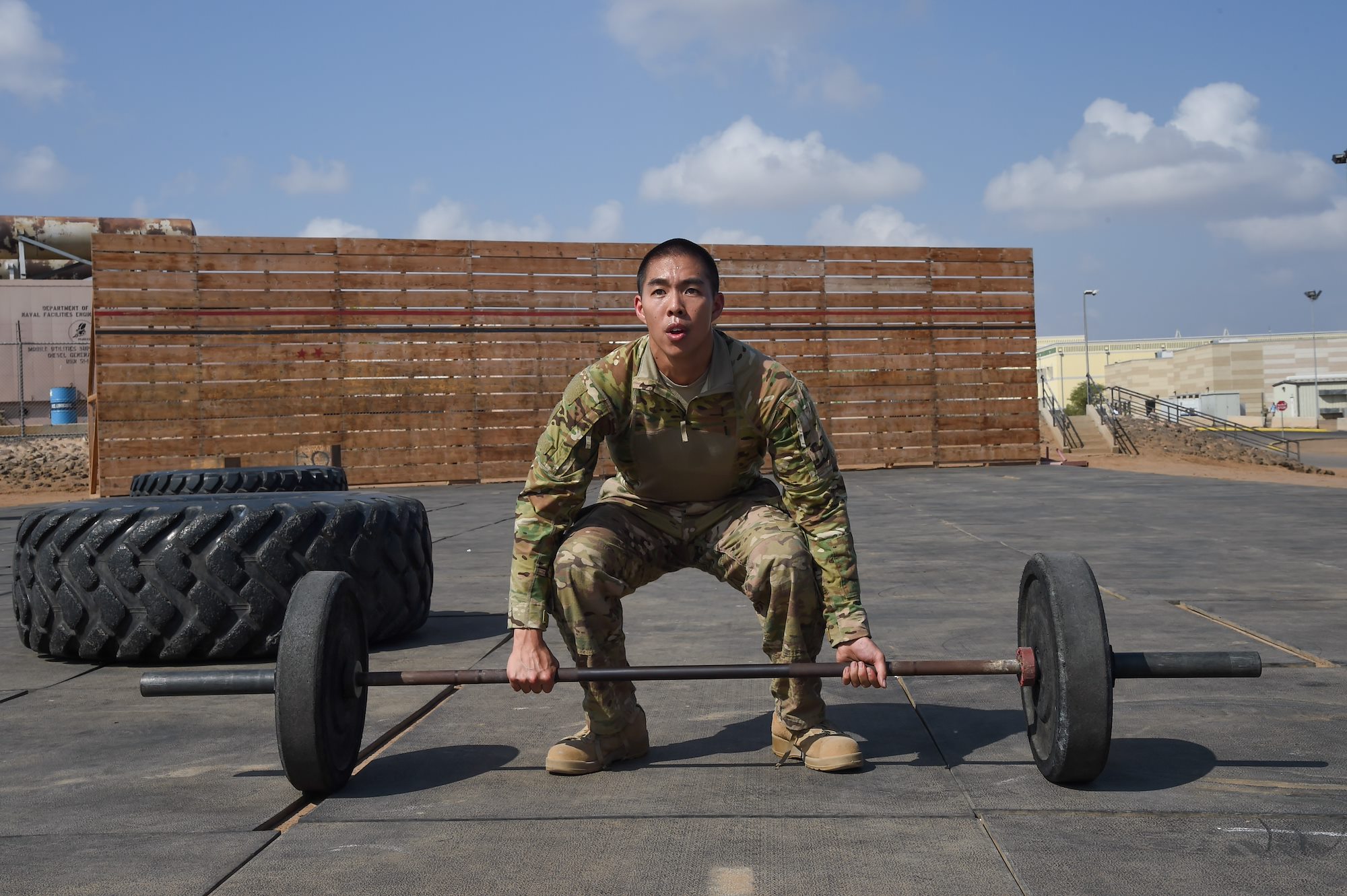 U.S. Air Force Cpt. Alexander Leong, Combined Joint Task Force-Horn of Africa personnel specialist, prepares for fifteen repetitions of a 135-pound deadlift during the Joint Warrior Competition, Nov. 19, 2016, Camp Lemonnier, Djibouti. After the joint physical fitness test, participants started the joint combat fitness test. The combat test was comprised of a low crawl, tourniquet application, buddy carry, radio medical evacuation, grenade toss, tire flip, ammo can carry, dead lift, and rope climb. (U.S. Air National Guard photo by Staff Sgt. Penny Snoozy)
