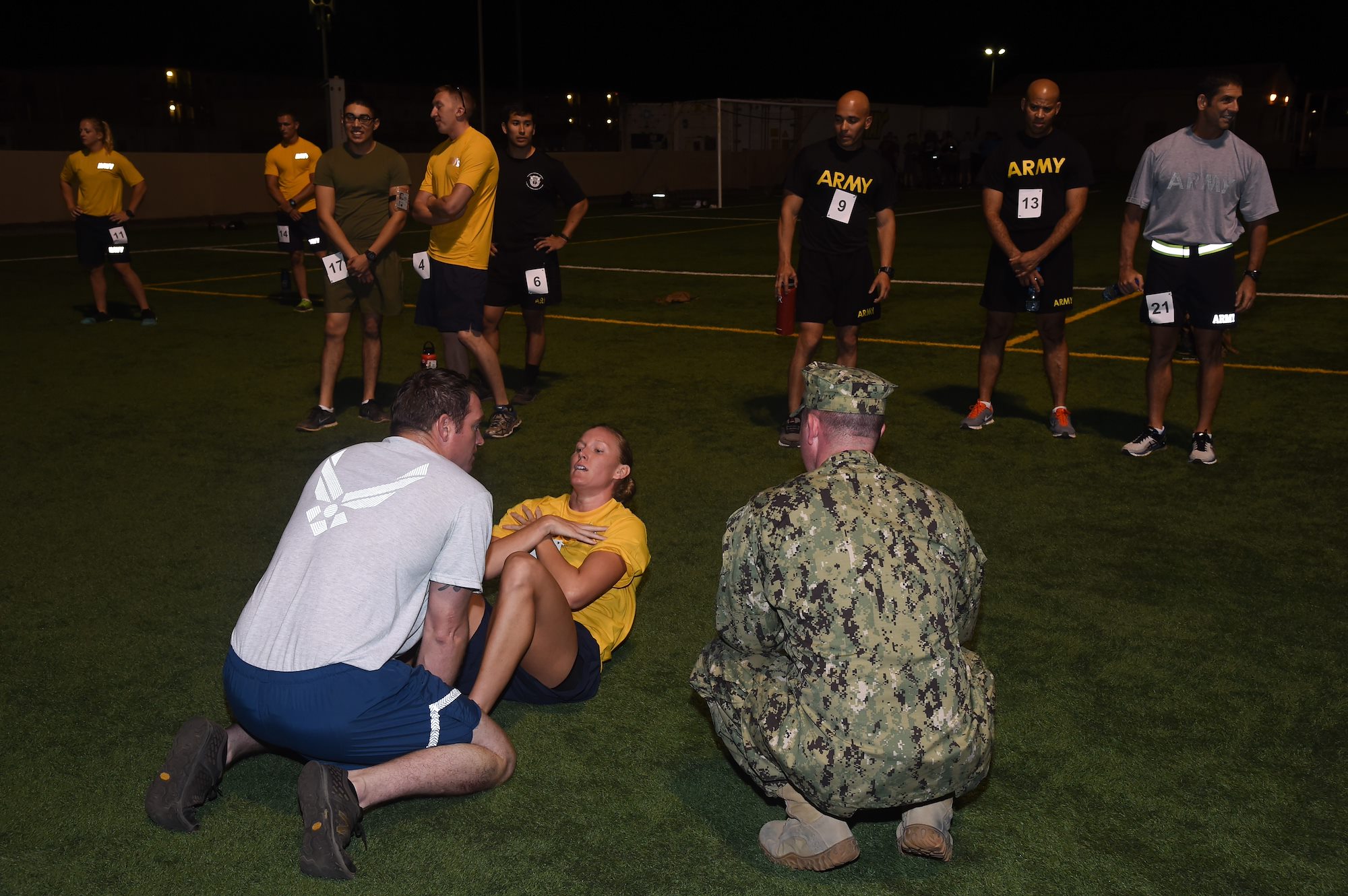 U.S. service members assigned to Combined Joint Task Force-Horn of Africa and Camp Lemonnier participate in the Joint Warrior Competition, Nov. 19, 2016, Camp Lemonnier, Djibouti. The third portion of the joint physical fitness test was the Navy curl-up. Members involved in the event met on the turf field pre-dawn to begin the day of events. (U.S. Air National Guard photo by Staff Sgt. Penny Snoozy)