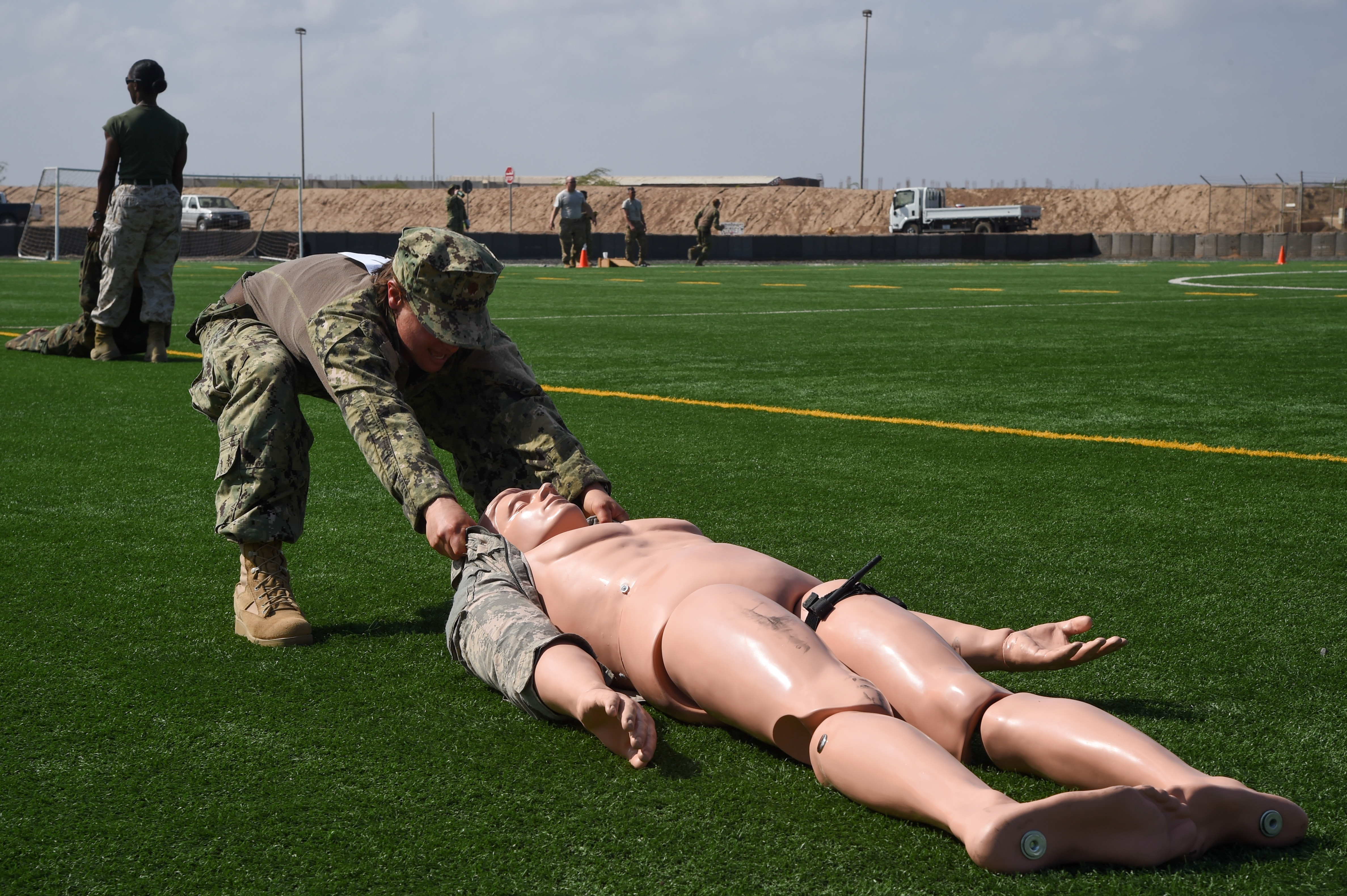 U.S. Navy Lt. Cmdr. Elisabeth Erickson, Combined Joint Task Force-Horn of Africa, drags a dummy 25-meters after applying a tourniquet during the Joint Warrior Competition, Nov. 19, 2016, Camp Lemonnier, Djibouti. After the joint physical fitness test, participants started the joint combat fitness test. The combat test was comprised of a low crawl, tourniquet application, buddy carry, radio medical evacuation, grenade toss, tire flip, ammo can carry, dead lift, and rope climb. (U.S. Air National Guard photo by Staff Sgt. Penny Snoozy)