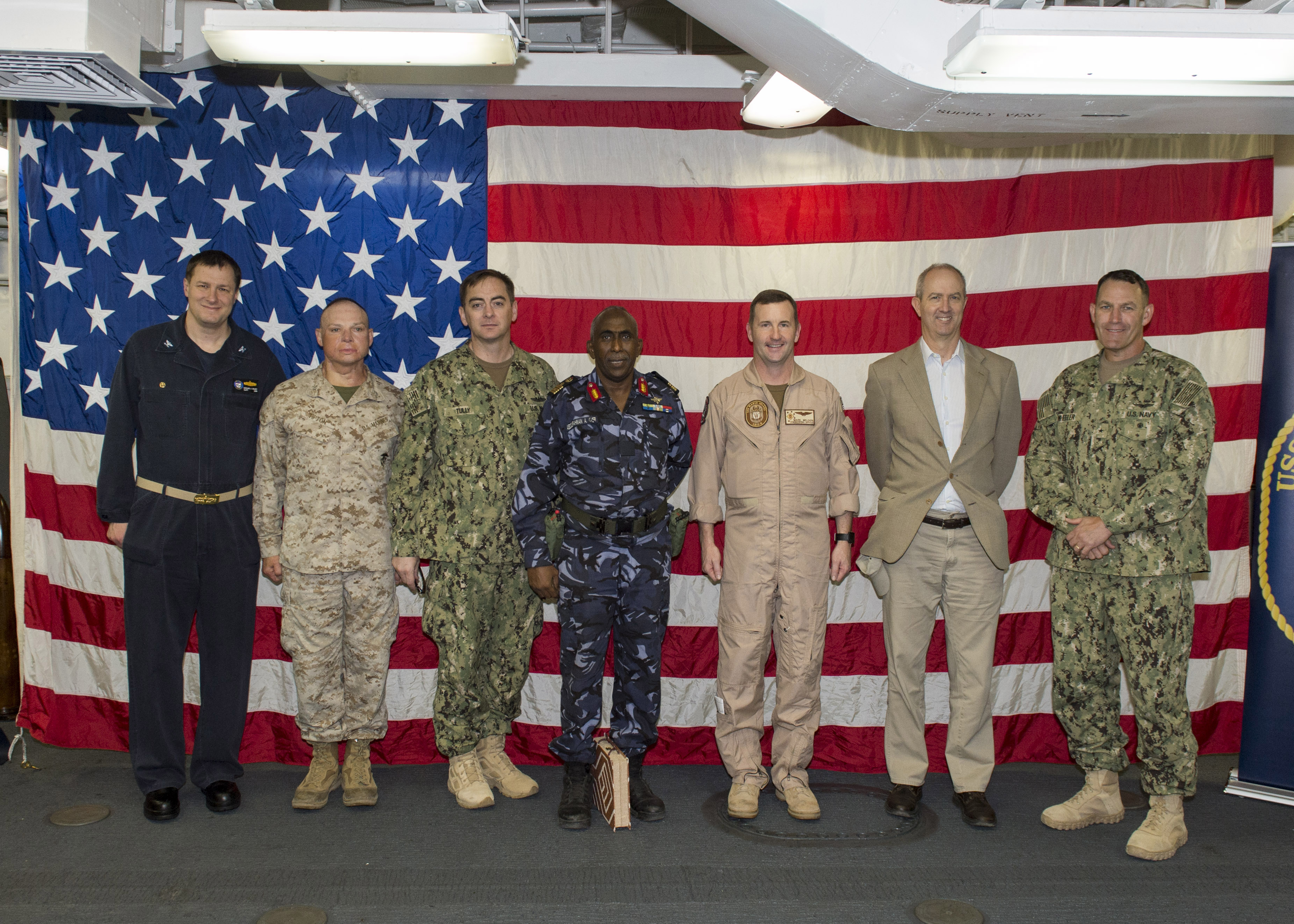 GULF OF ADEN (Dec. 16, 2016) Left to right, Commander, Amphibious Squadron Five Capt. Michael Crary, 11th Marine Expeditionary Unit Commanding Officer Col. Clay Tipton, Defense Attaché at U.S. Embassy Djibouti Capt. John Tully, Chief of Djiboutian Navy Col. Abdourahman Cher, USS Makin Island (LHD 8) Commanding Officer Capt. Mark Melson, U.S. Ambassador to Djibouti Mr. Tom Kelly, and Deputy Commander, Combined Joint Task Force – Horn of Africa Rear Adm. William W. Wheeler III meet on Makin Island’s underway quarterdeck before touring the amphibious assault ship. Makin Island is deployed as part of the Makin Island Amphibious Ready group to the U.S. 5th Fleet area of operations to support maritime security operations and theater security cooperation efforts. (U.S. Navy photo by Petty Officer 3rd Class Devin M. Langer)