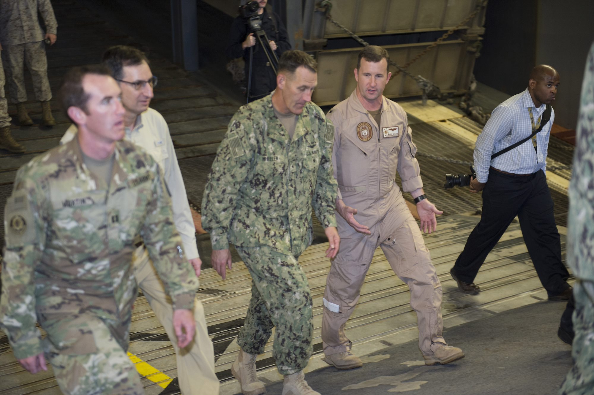 U.S. 5TH FLEET AREA OF OPERATIONS (Dec. 16, 2016) Rear Adm. William W. Wheeler, Deputy Commander, Combined Joint Task Force - Horn of Africa, meets Sailors on the Makin Island’s underway quarterdeck during a tour aboard the amphibious assault ship. Makin Island is deployed as part of the Makin Island Amphibious Ready group to the U.S. 5th Fleet area of operations to support maritime security operations and theater security cooperation efforts. (U.S. Navy photos by Petty Officer 3rd Class Devin M. Langer)
