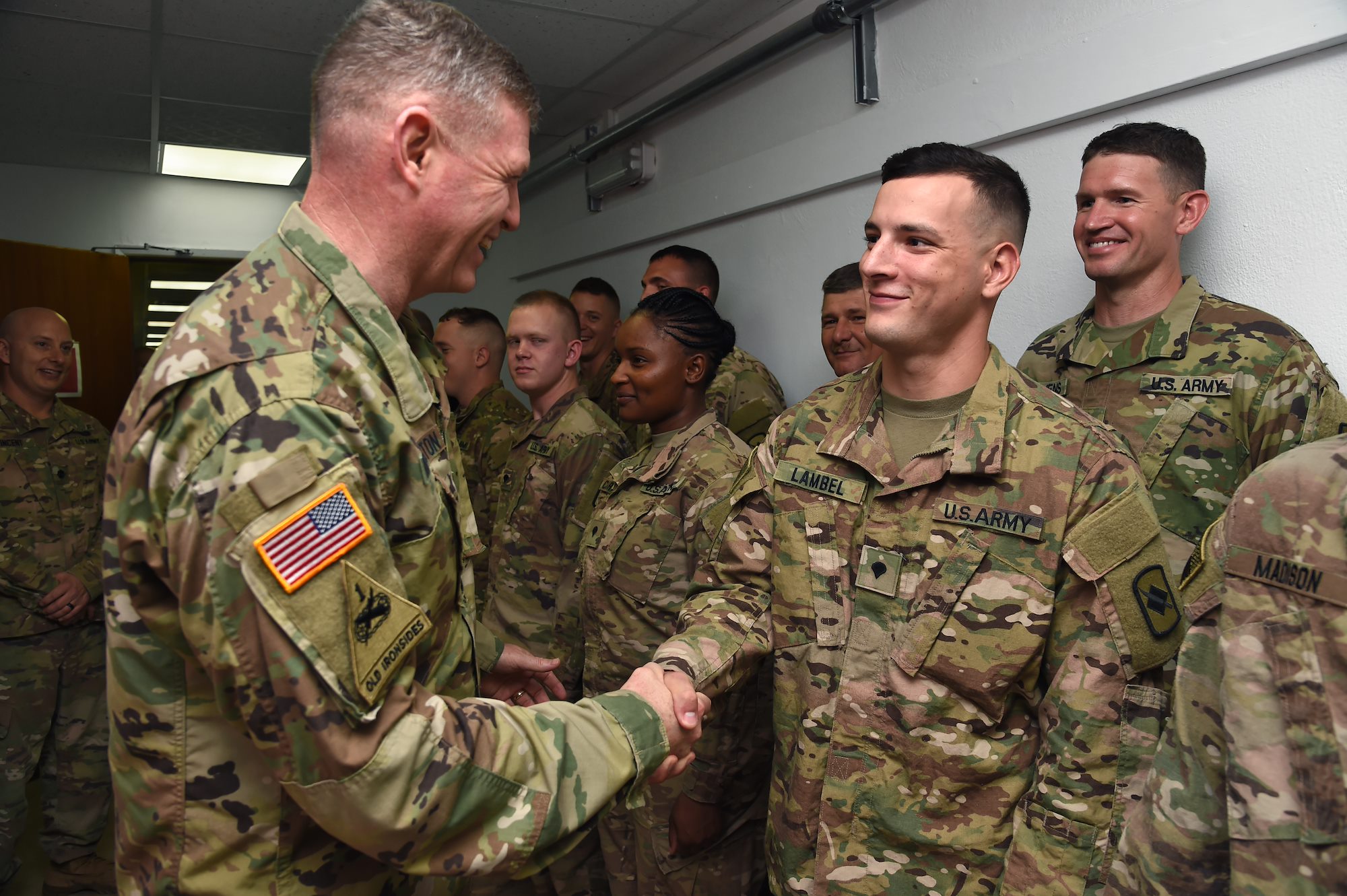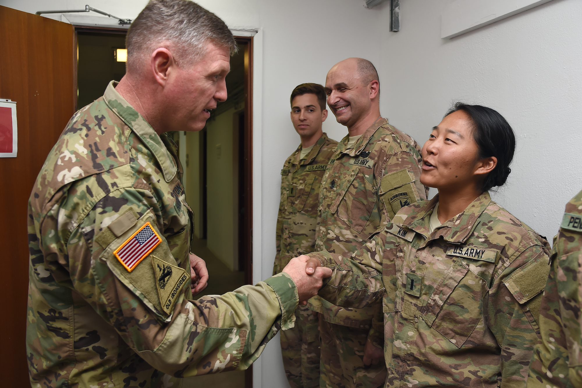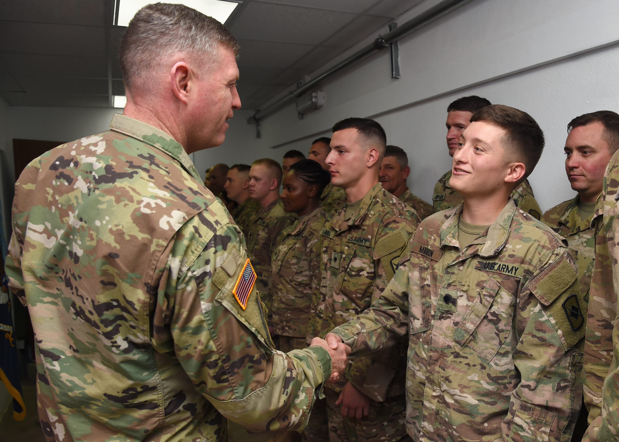 U.S. Army Maj. Gen. Joseph Harrington, commanding general of U.S. Army Africa visits with infantry and civil affairs Soldiers assigned to Combined Joint Task Force-Horn of Africa at Camp Lemonnier, Djibouti, March 22, 2017.