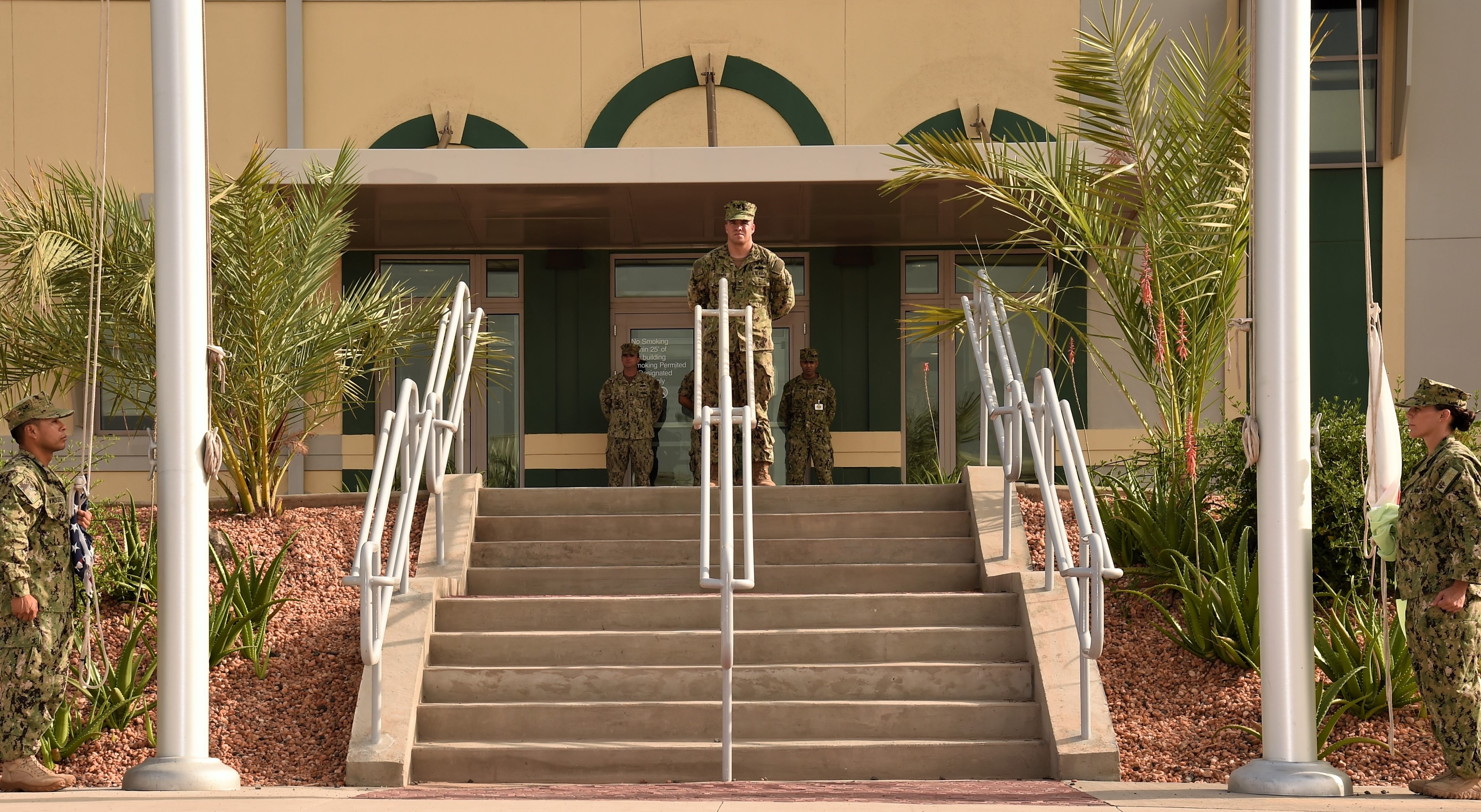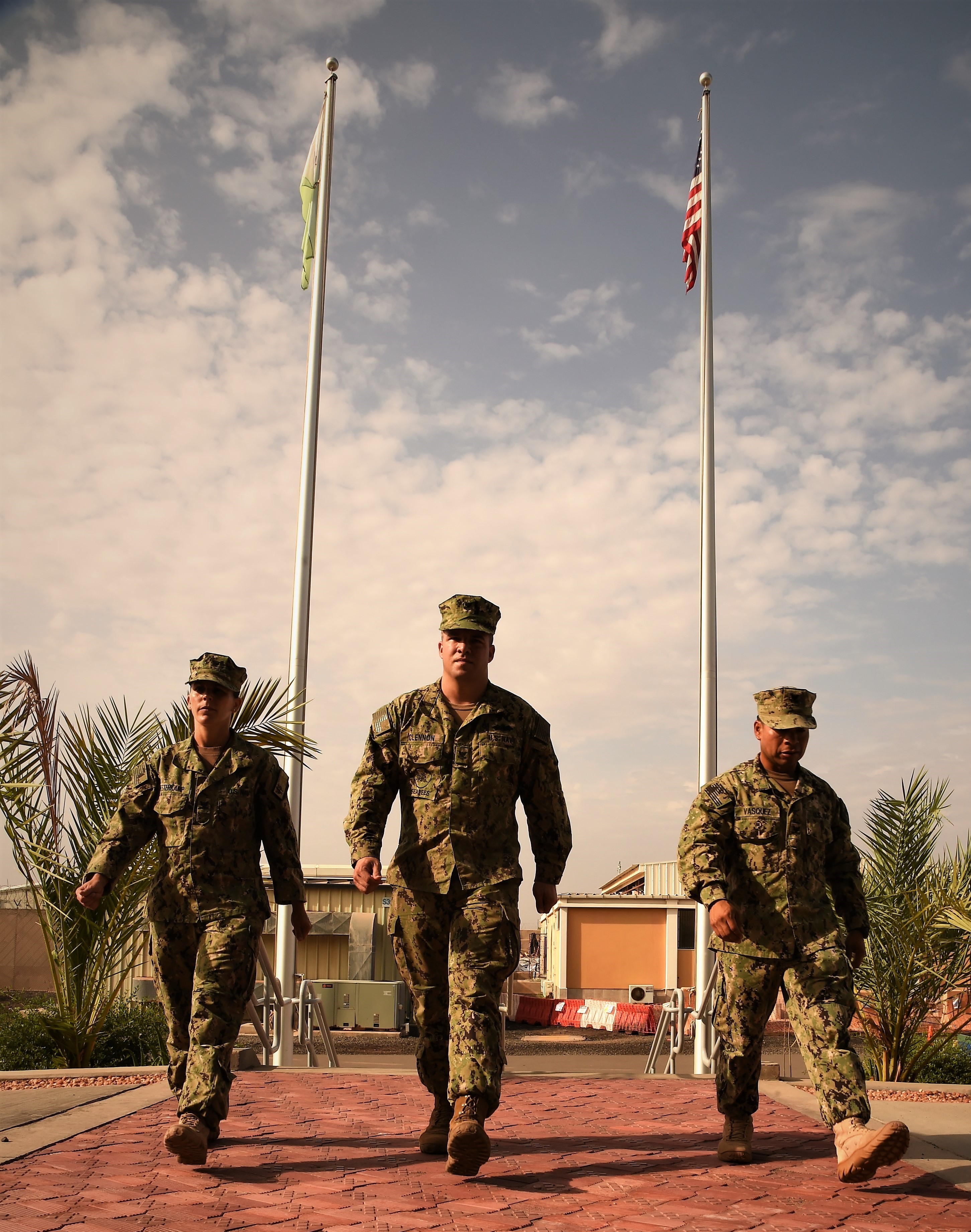 Left to right, Petty Officer 3rd Class Lisa Westercamp, Petty Officer 2nd Class Timothy Clennon and Petty Officer 2nd Class Noe Vasquez march away after raising the Colors on Camp Lemonnier, Djibouti, the morning of May 17, 2017. The event marked the first time this events was conducted in front of one of the installation’s newest structures, honoring both the U.S. and Djiboutian flags. (U.S Air National Guard photos by Tech. Sgt. Andria Allmond)