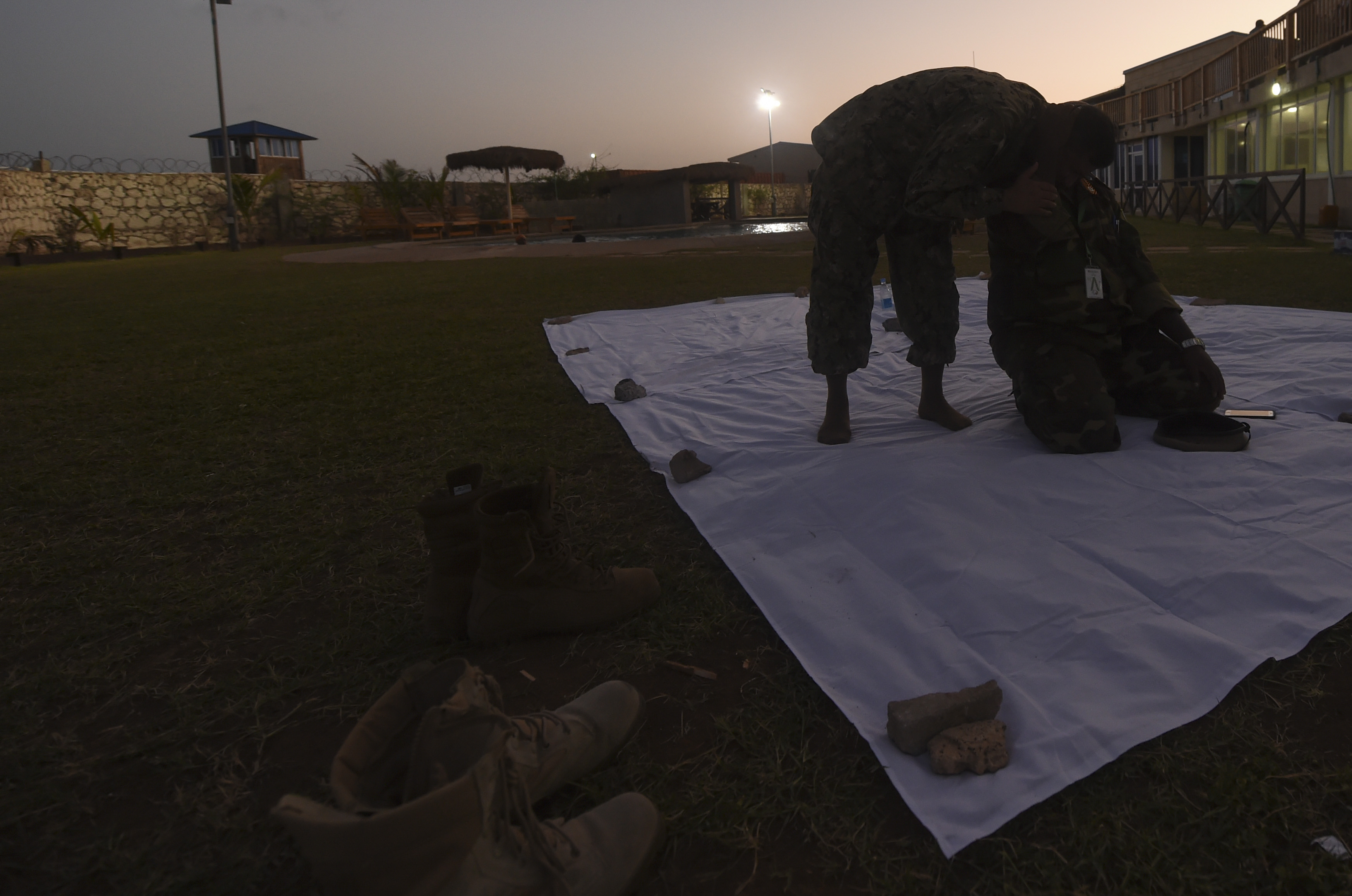 Military boots rest near a sheet placed on the ground for a prayer before an Iftar with members of the Somali National Army at the Mogadishu International Airport, Mogadishu, Somalia, June 5, 2017. This was the first Iftar held between U.S. and SNA military personnel. Additionally, it was the first led by a U.S. Imam, who is a leader in the Islamic faith. (U.S. Air Force Photo by Staff Sgt. Eboni Prince)