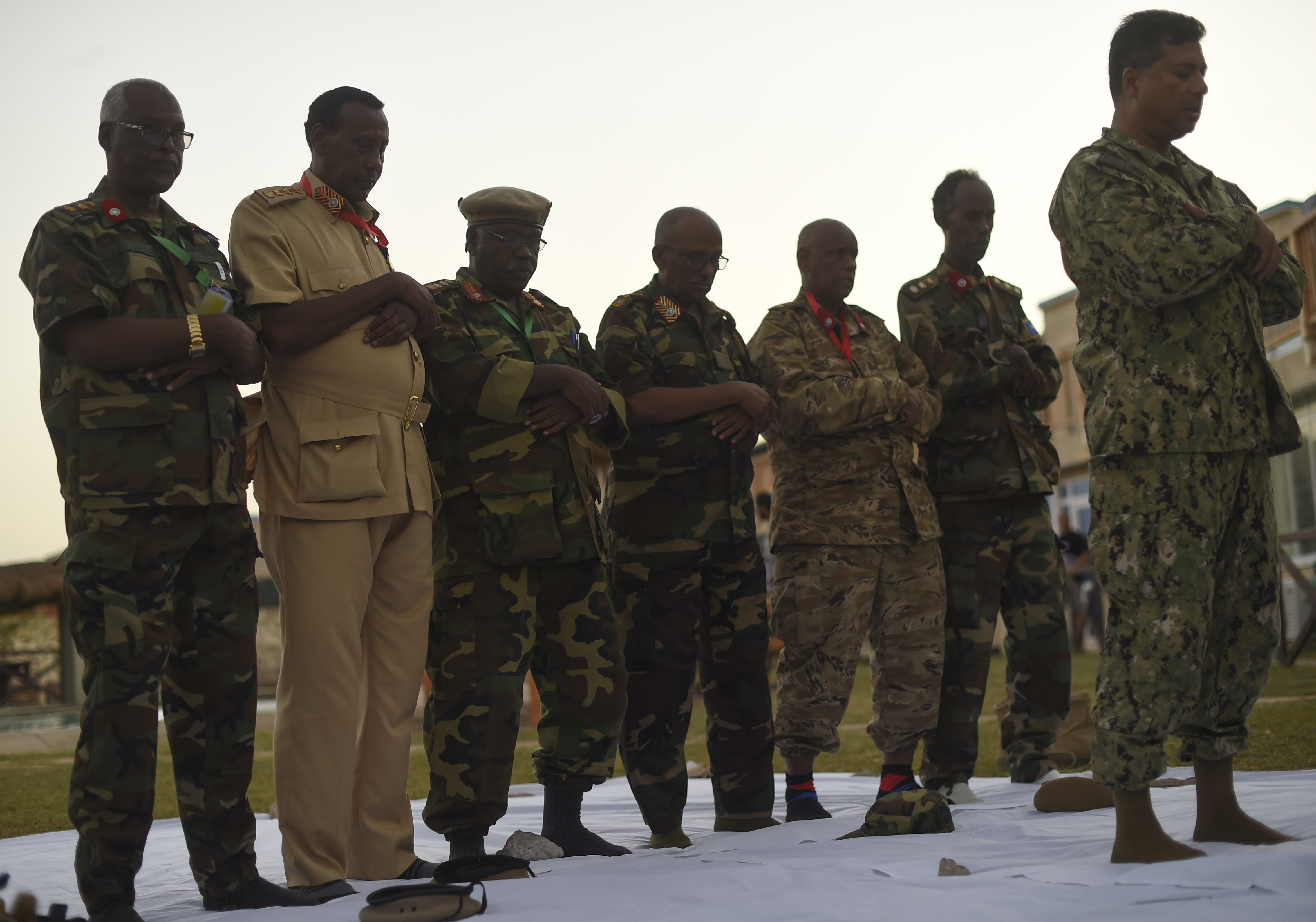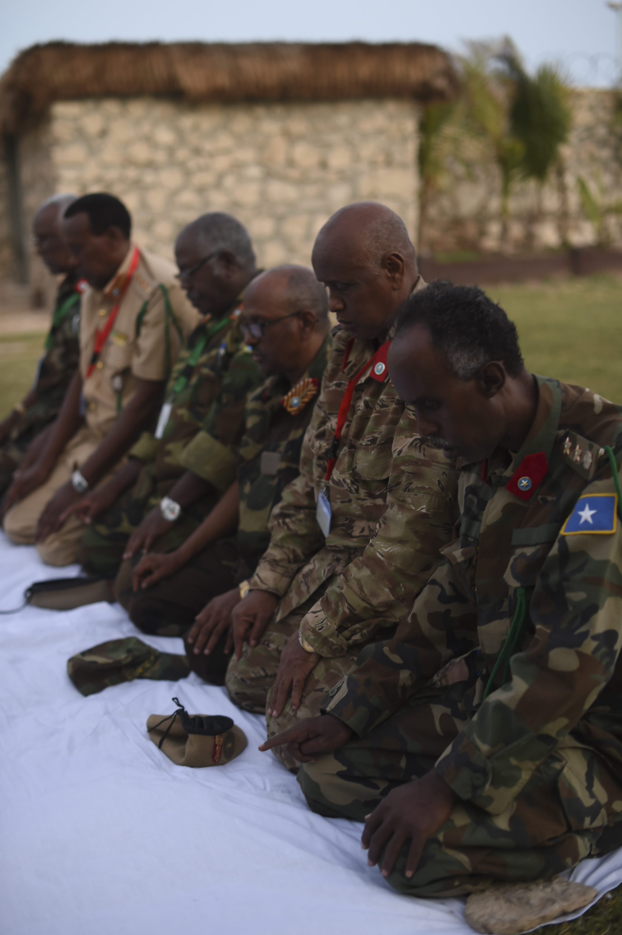 Members of the Somali National Army kneel to pray before an Iftar at the Mogadishu International Airport, Mogadishu, Somalia, June 5, 2017. Iftar is the evening meal when Muslims end their daily Ramadan fast at sunset. (U.S. Air Force Photo by Staff Sgt. Eboni Prince)