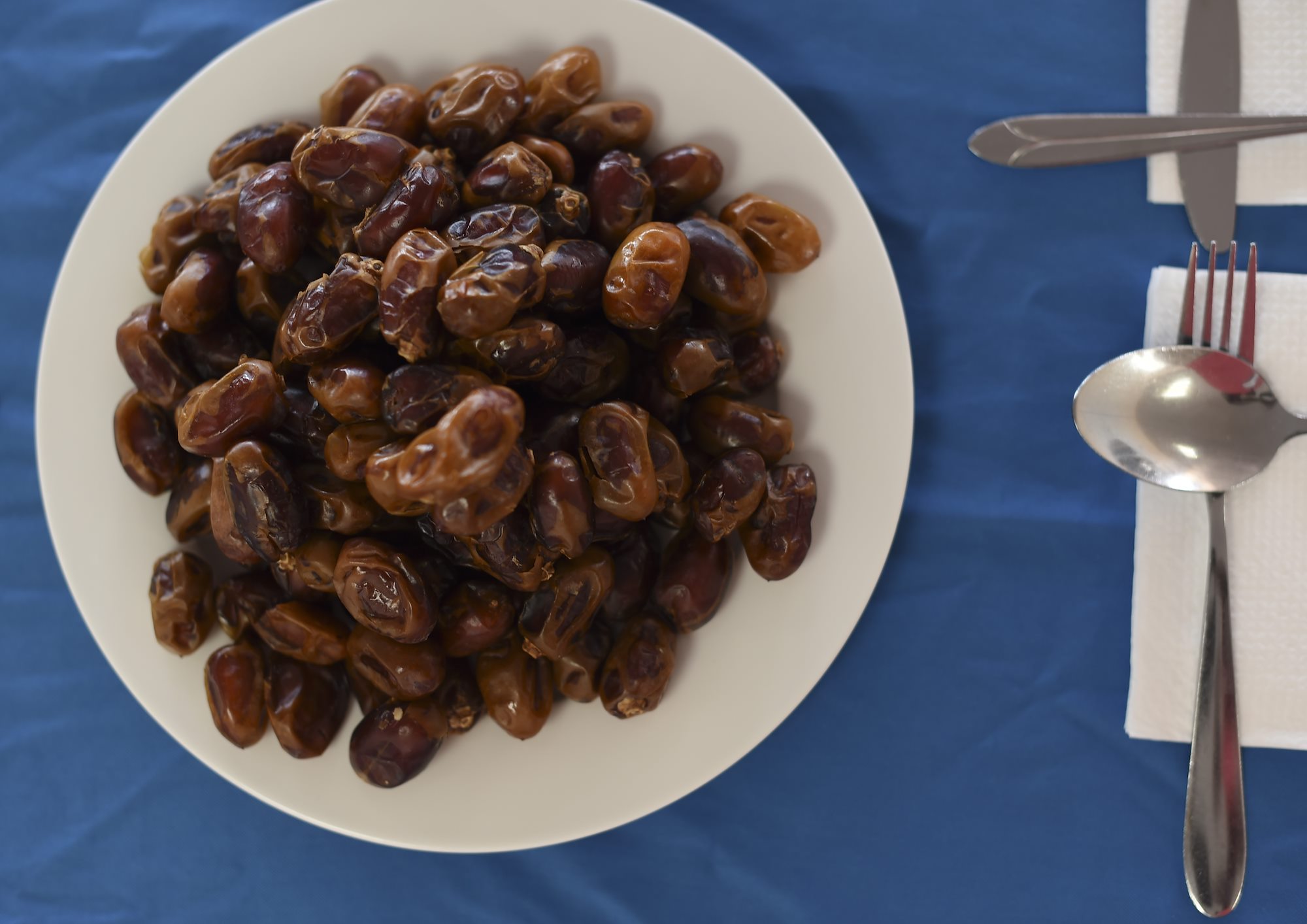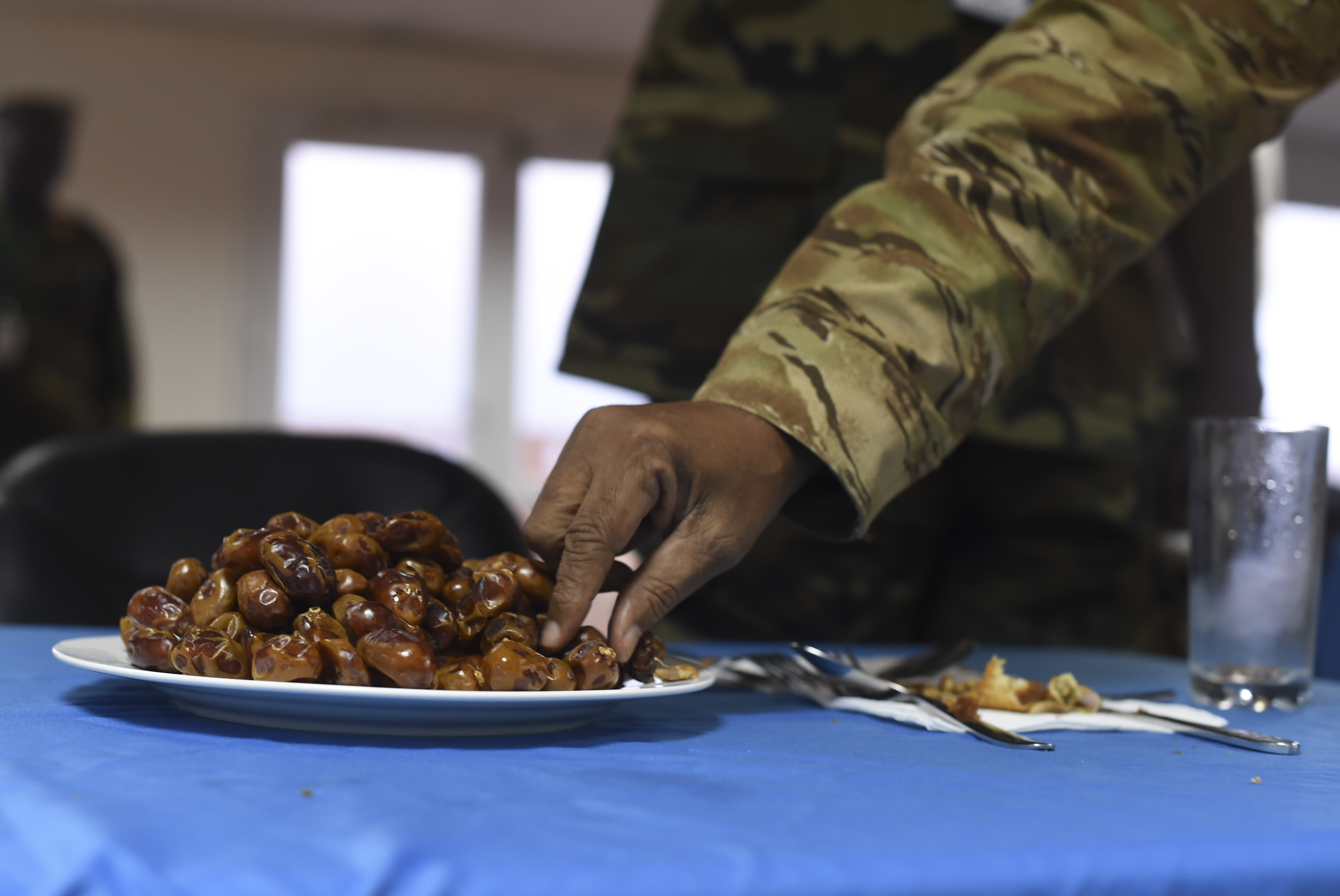 A plate of dates rests on a table before an Iftar held in Mogadishu, Somalia, June 5, 2017. During Ramadan, Muslims abstain from food and drink, including water from dawn till dusk. After sunset, eating dates and drinking water traditionally breaks the fast. (U.S. Air Force Photo by Staff Sgt. Eboni Prince)