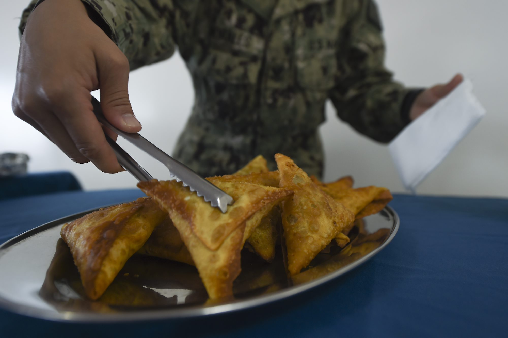 U.S. Navy Petty Officer 2nd Class Jocelyn Morales, Combined Joint Task Force – Horn of Africa religious affairs chaplain assistant, prepares a plate of samosas for a dual-service Iftar at the Mogadishu International Airport in Mogadishu, Somalia, June 5, 2017. Iftar is the evening meal when Muslims end their daily Ramadan fast at sunset.(U.S. Air Force photo by Staff Sgt. Eboni Prince)