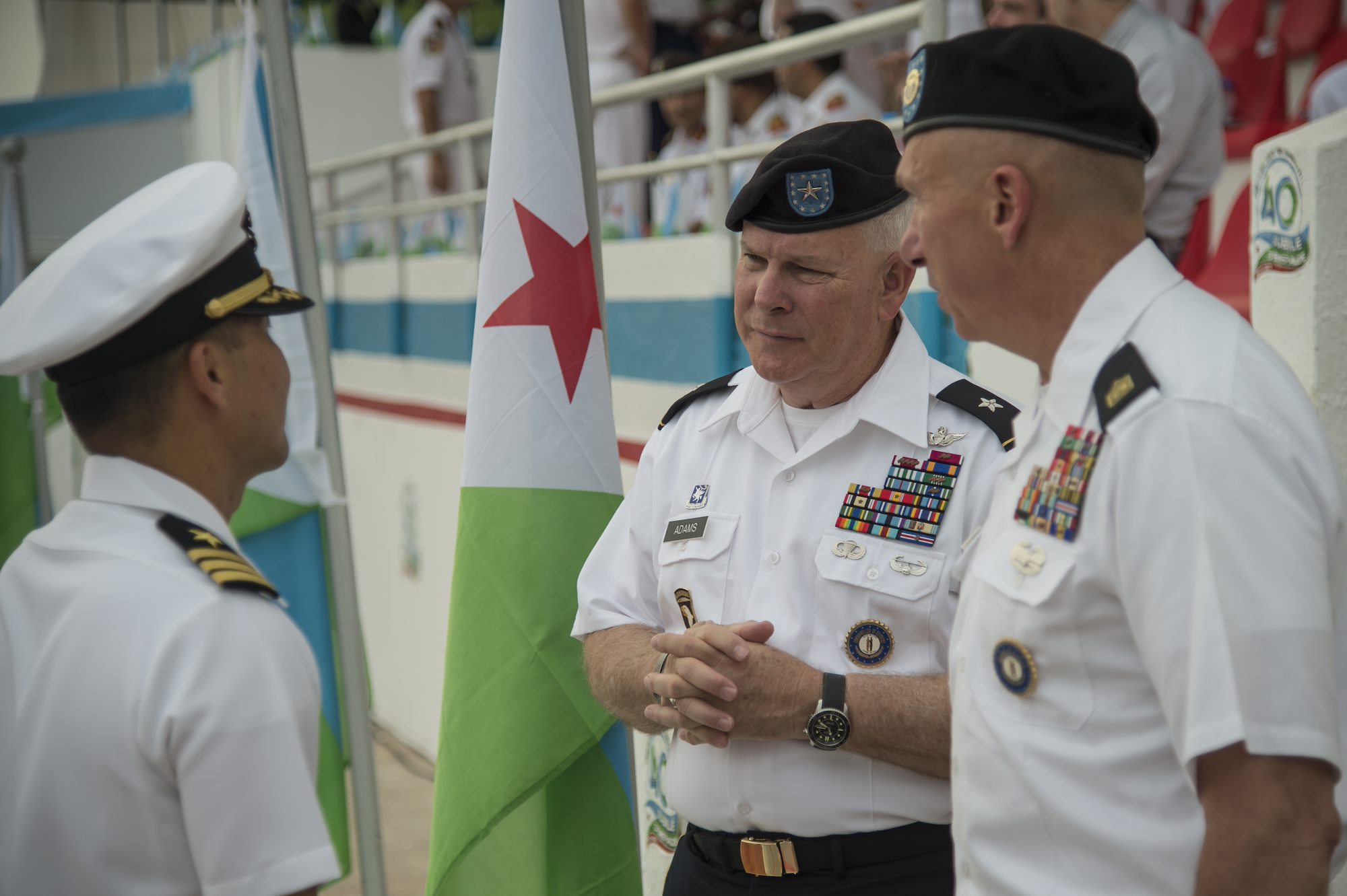 U.S. participation in the parade was widespread. Leaders of CJTF-HOA and Camp Lemonnier were joined by U.S. Army Brig. Gen. Benjamin F. Adams III, Kentucky National Guard Land Component commander. The Kentucky National Guard partners with the Republic of Djibouti through the National Guard State Partnership program. This partnership is used to cooperate on many shared initiatives and to provide operational support to U.S. Africa Command.