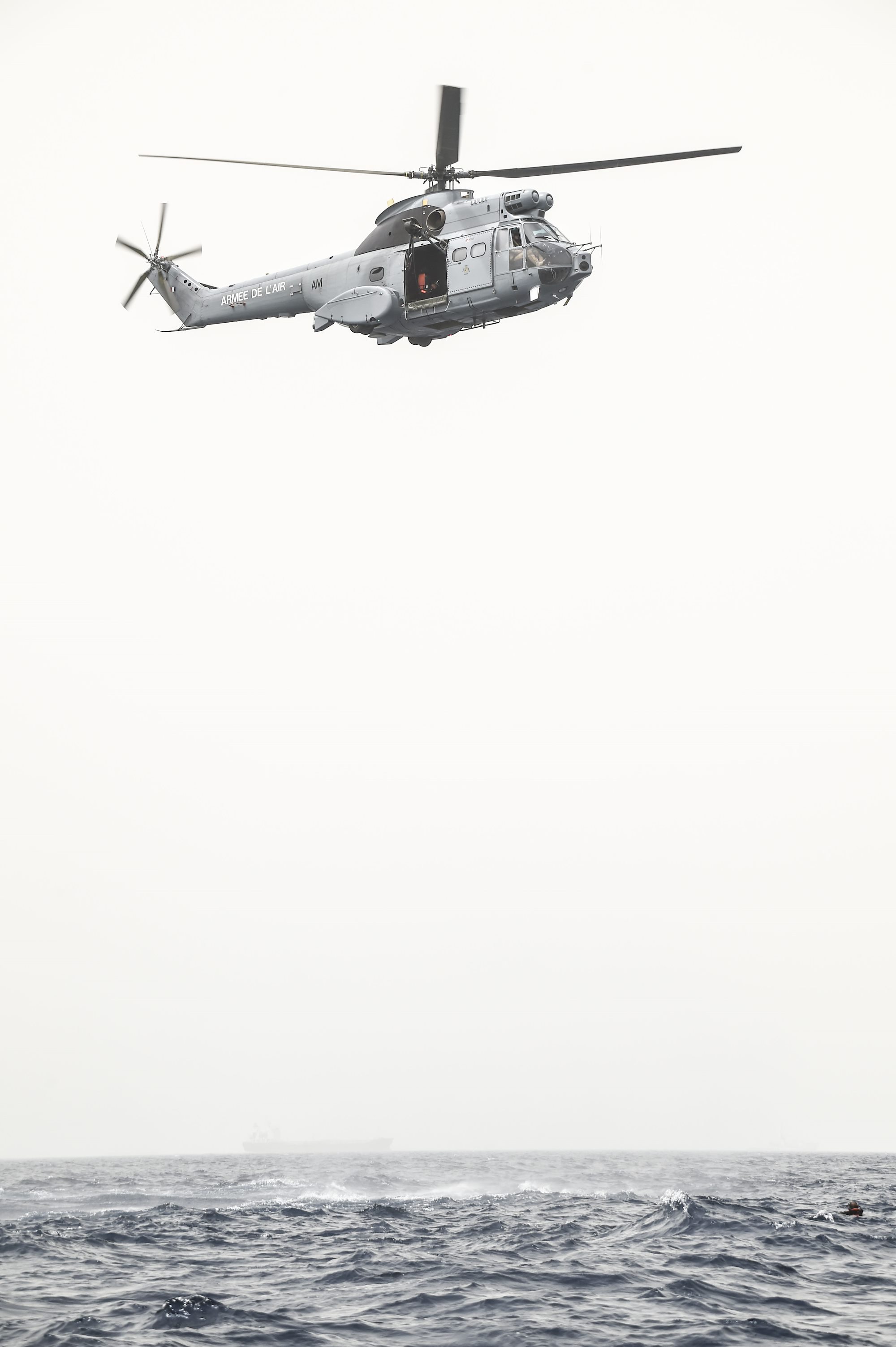 A French Air Force Aérospatiale SA 330 Puma helicopter hovers over the Gulf of Tadjoura during a bilateral water operations exercise, July 3, 2017. The results of the exercise will aid in the development of standard operating procedures between Combined Joint Task Force-Horn of Africa and the French Forces stationed in Djibouti for the U.S. and France’s mutual support of maritime rescue capabilities within the Horn of Africa region. (U.S. Air Force photo by Staff Sgt. Eboni Prince)