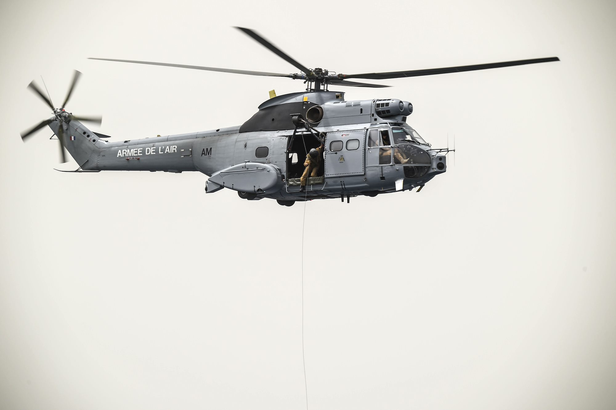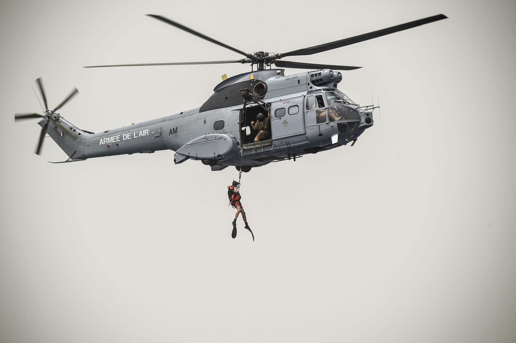 A French Air Force member assigned to the Transport Squadron ET 88 and a U.S. Air Force pararescueman from the 82nd Expeditionary Rescue Squadron, assigned to Combined Joint Task Force-Horn of Africa, are hoisted by a cable to a French Air Force Aérospatiale SA 330 Puma helicopter during a bilateral water operations exercise, in the Gulf of Tadjoura, July 3, 2017. The results of the exercise will aid in the development of standard operating procedures between CJTF-HOA and the French Forces stationed in Djibouti for the U.S. and France’s mutual support of maritime rescue capabilities within the Horn of Africa region. (U.S. Air Force photo by Staff Sgt. Eboni Prince)