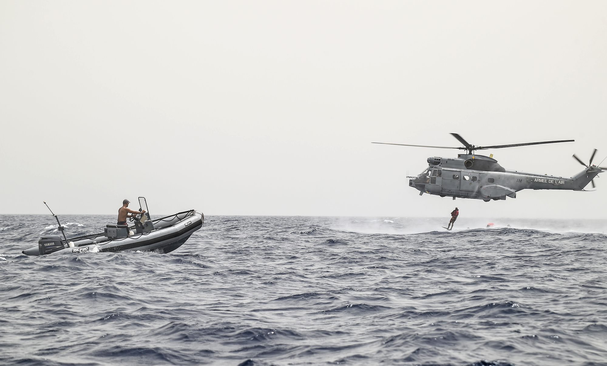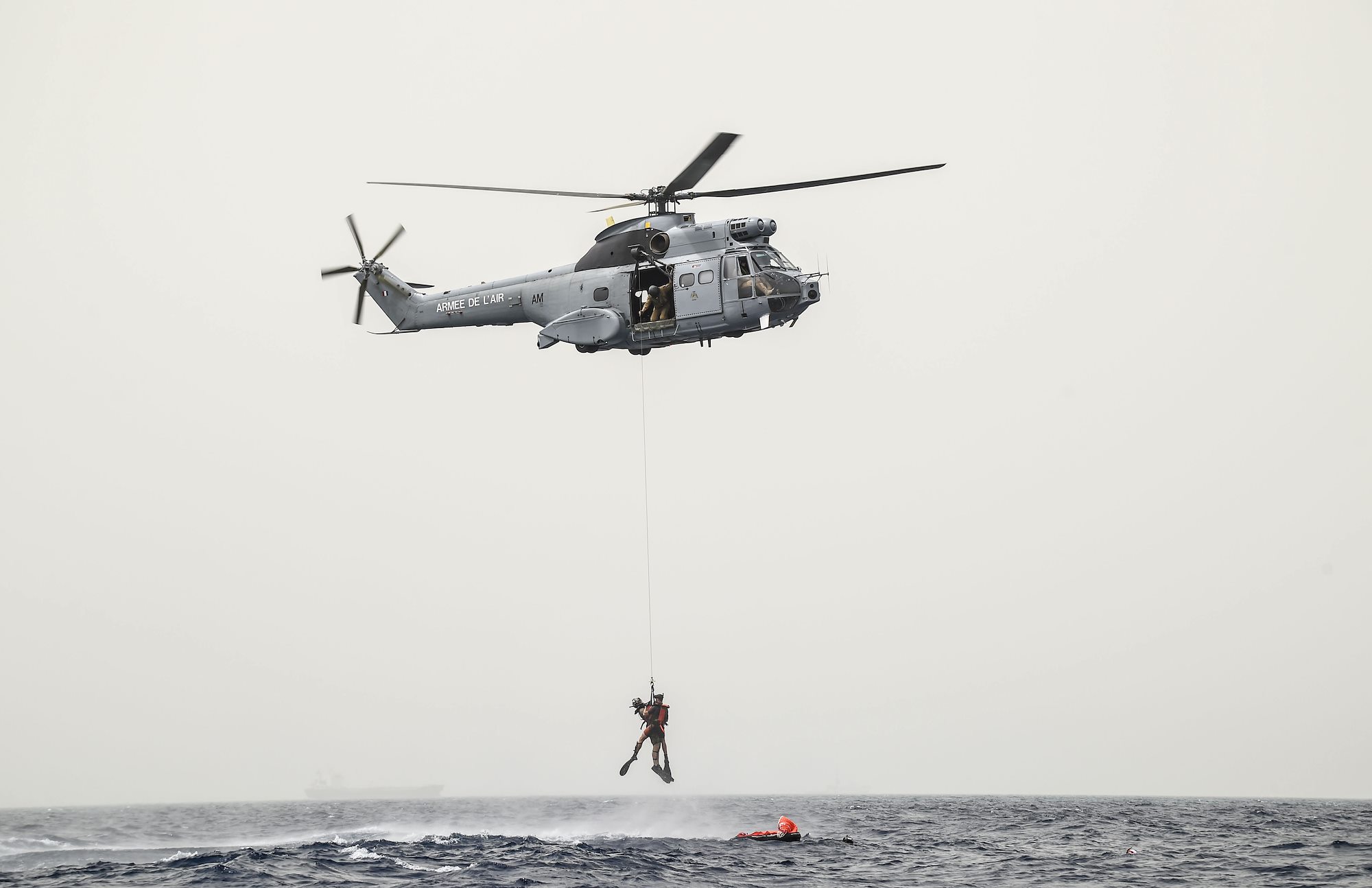 A French Air Force member assigned to the Transport Squadron ET 88 is hoisted from into a French Air Force Aérospatiale SA 330 Puma helicopter during a bilateral water operations exercise, in the Gulf of Tadjoura, July 3, 2017. The results of the exercise will aid in the development of standard operating procedures between CJTF-HOA and the French Forces stationed in Djibouti for the U.S. and France’s mutual support of maritime rescue capabilities within the Horn of Africa region. (U.S. Air Force photo by Staff Sgt. Eboni Prince)