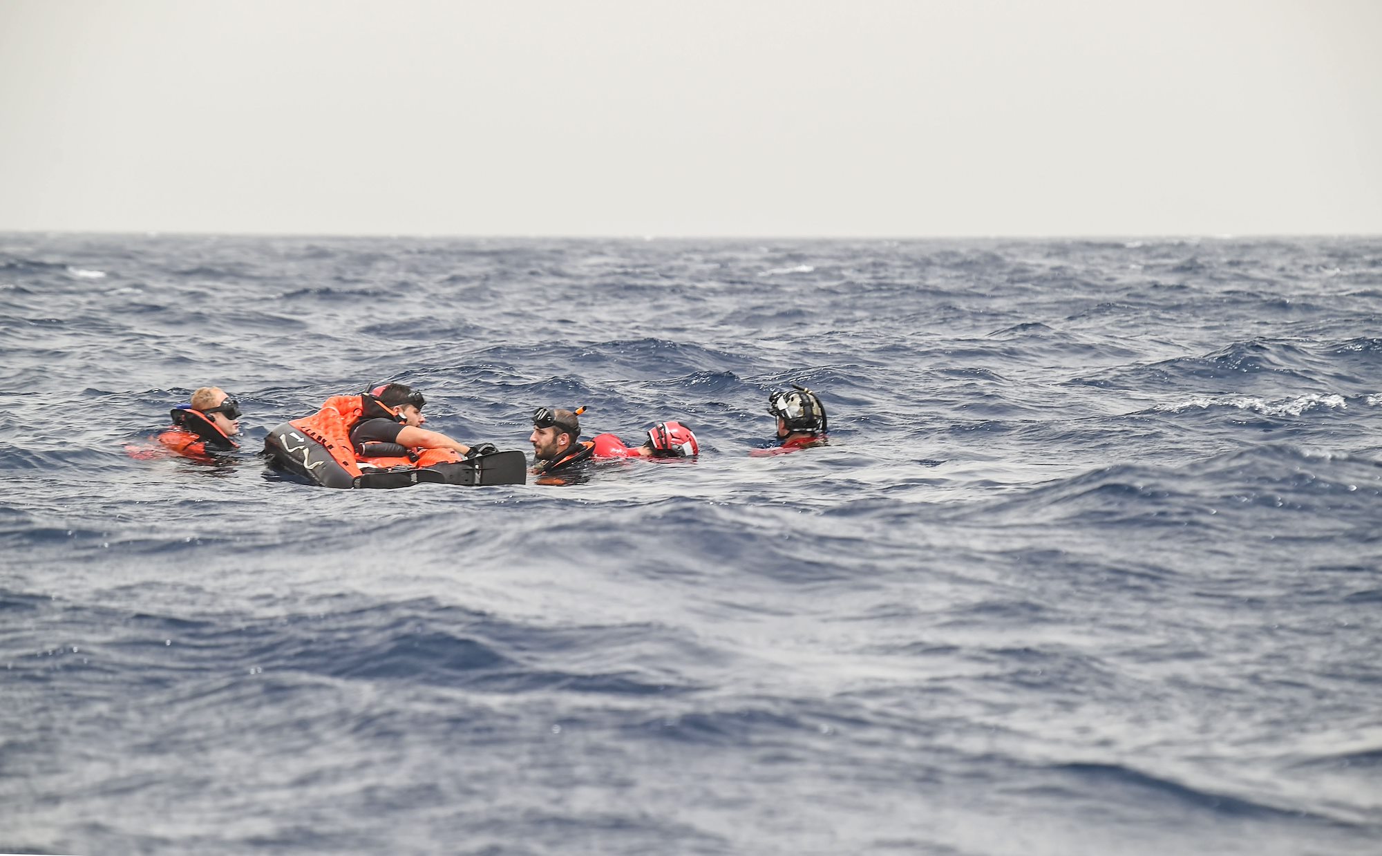 French Air Force rescue personnel assigned to the Transport Squadron ET 88 participate in a bilateral water operations exercise with pararescuemen from the 82nd Expeditionary Rescue Squadron, assigned to Combined Joint Task Force-Horn of Africa, in the Gulf of Tadjoura, July 3, 2017. The results of the exercise will aid in the development of standard operating procedures between CJTF-HOA and the French Forces stationed in Djibouti for the U.S. and France’s mutual support of maritime rescue capabilities within the Horn of Africa region. (U.S. Air Force photo by Staff Sgt. Eboni Prince)