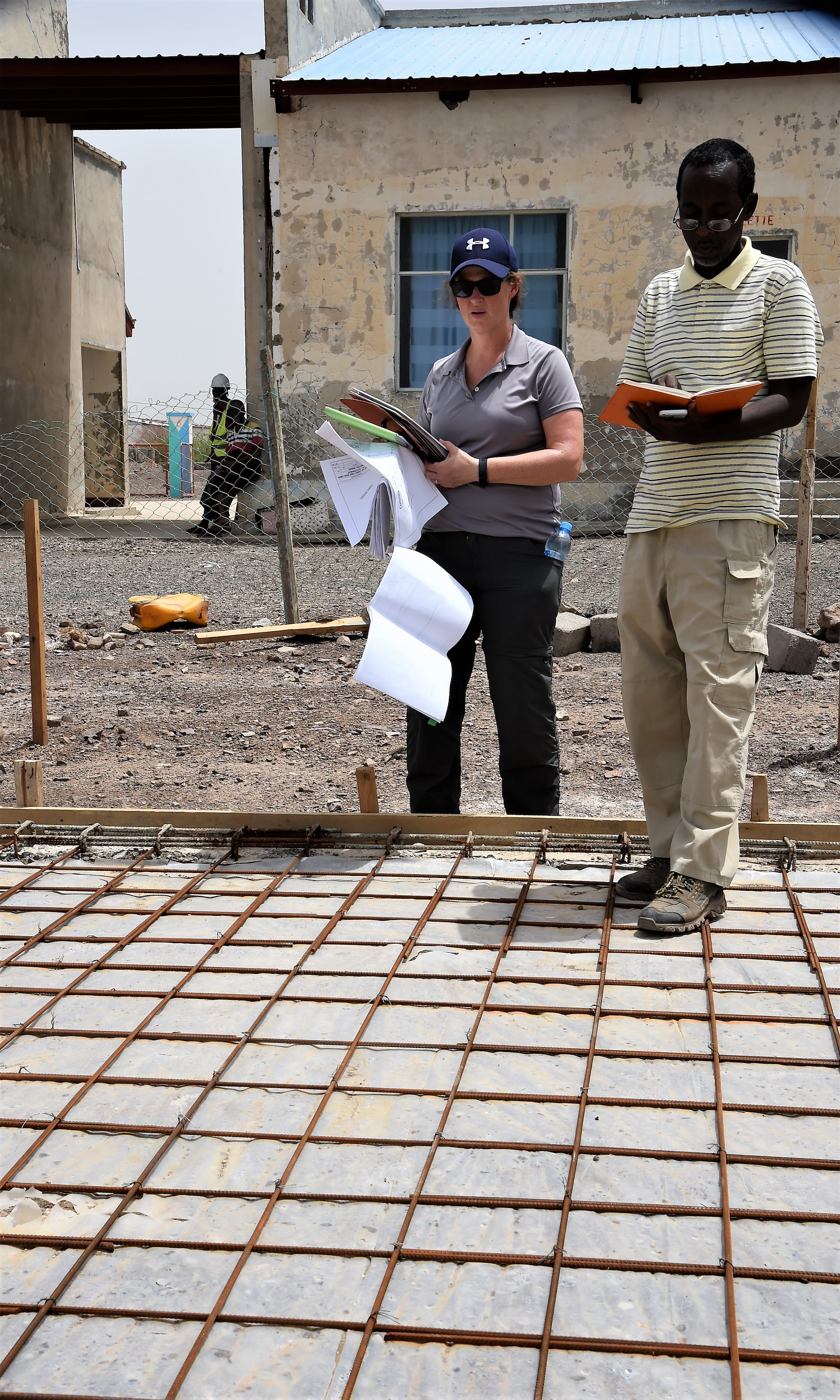 But Chavez didn’t seem to notice the elements swirling around her. Her gaze fixated on the ground, she broke her stare only to confer with a stack of plans and specifications -- she had a job to do. Chavez, a construction project manager with the CJTF-HOA Logistics Directorate, is invested in the success of this project that the Djiboutian construction team is working on.