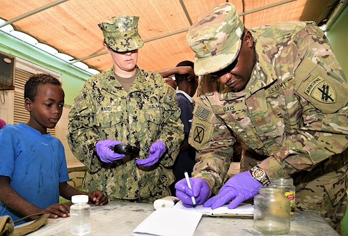 Led by U.S. Army Maj. Donald Dais, 443rd Civil Affairs Battalion Functional Specialty Team Environmental Health officer in charge, the unit conducted food-handler training, environmental health assessments, as well as tested multiple water sources for chlorine and bacteria levels at Caritas Djibouti – a mission serving humanitarian aid and education mostly to Djiboutian children living on the streets.
