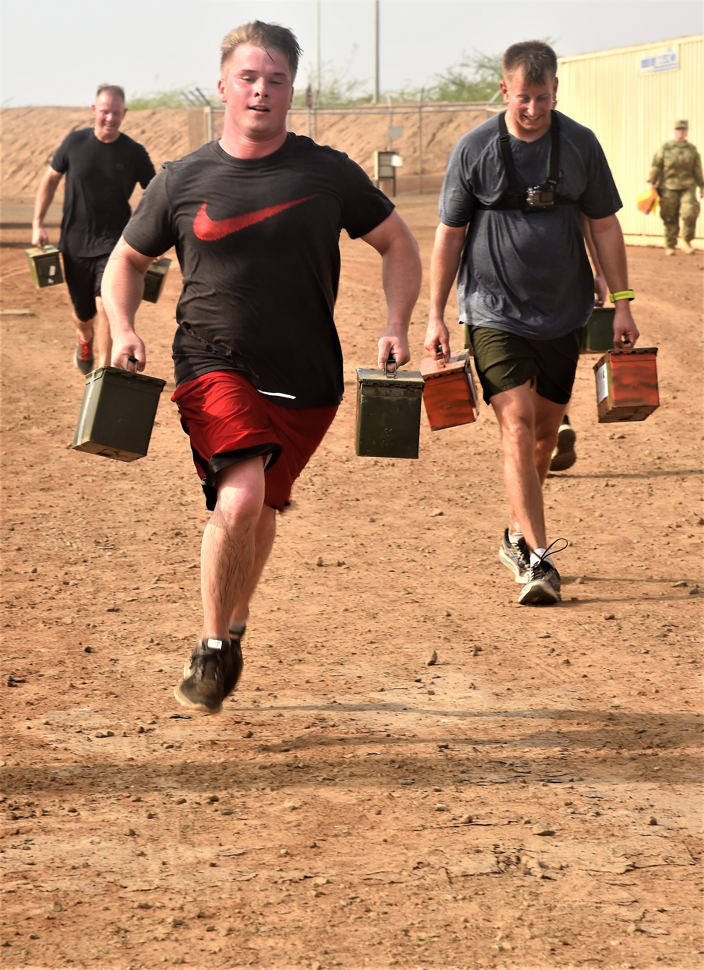 Service members of Combined Joint Task Force – Horn of Africa and Camp Lemonnier participate in the ammunition-can carry portion of the Joint Warrior Competition, Djibouti, Sep. 9, 2017. Beforehand, competitors endured a 7-km run, 600-meter swim, 7-km ruck march, and pull-ups. The event was an opportunity for participants to appreciate the joint military force, showcase teamwork and remember 9/11. (U.S. Air National Guard photo by Tech. Sgt. Andria Allmond)