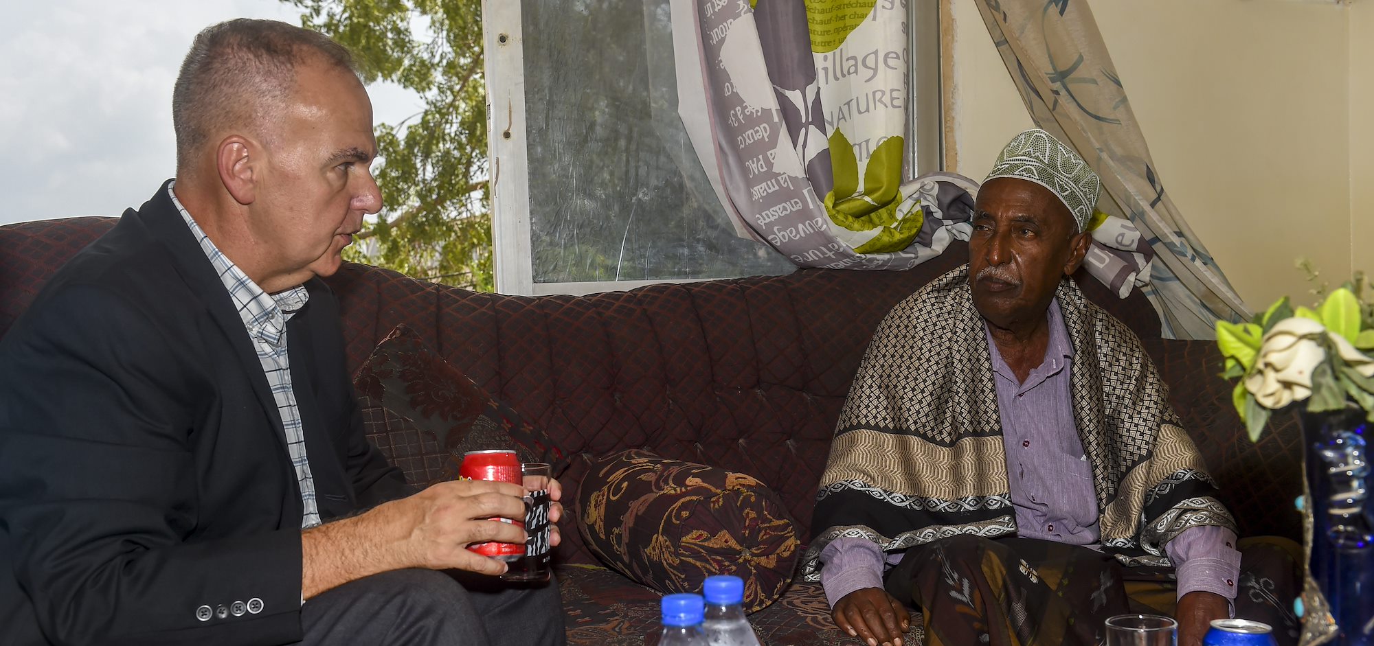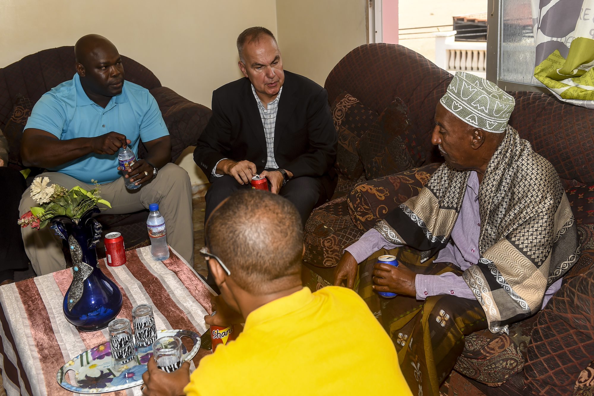 Members of the Combined Joint Task Force - Horn of Africa Religious Affairs office meet with Abdelkader Mohamed Humad (right), Sultan of Tadjoura, at his home in Djibouti City, Djibouti, Nov. 4, 2017.