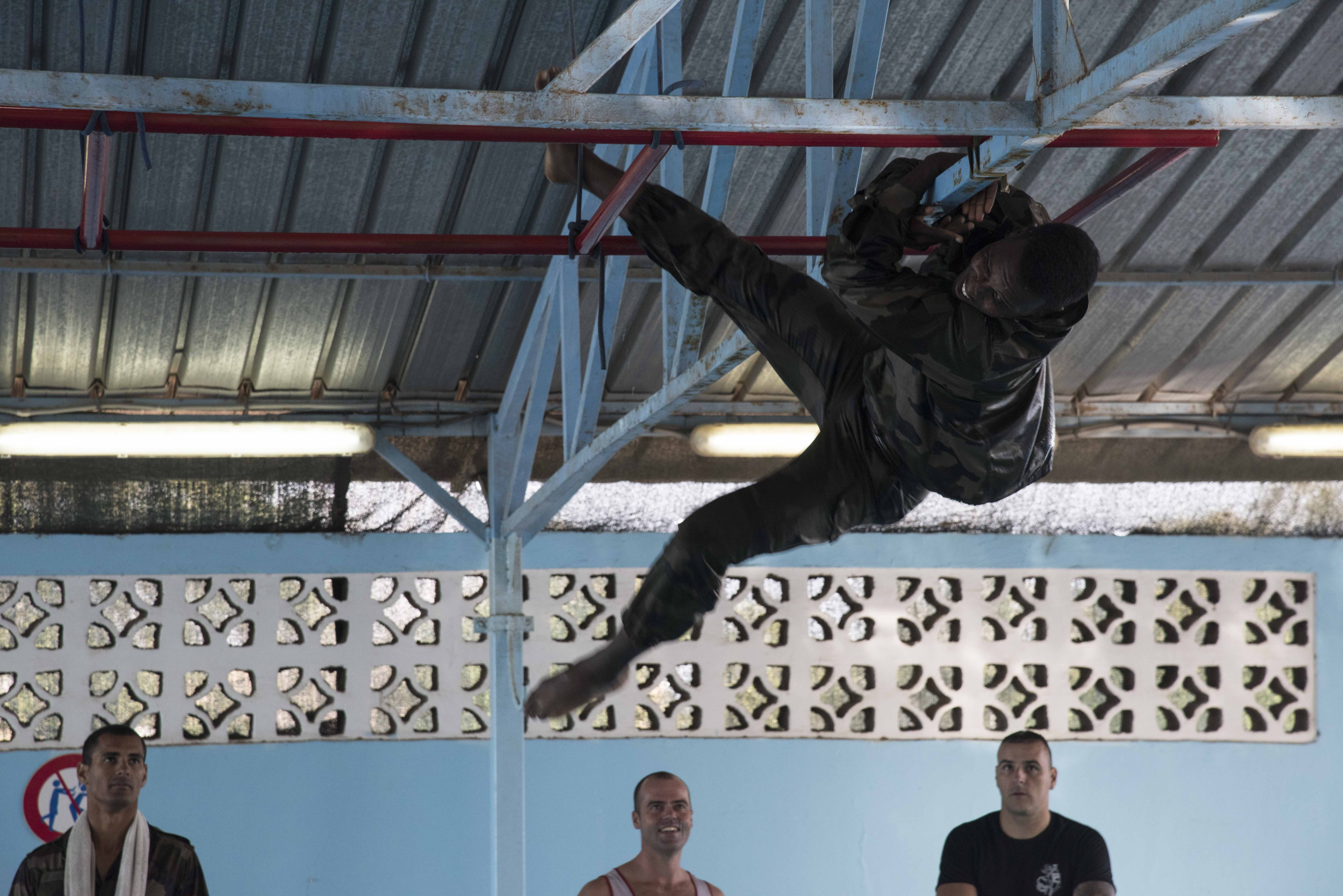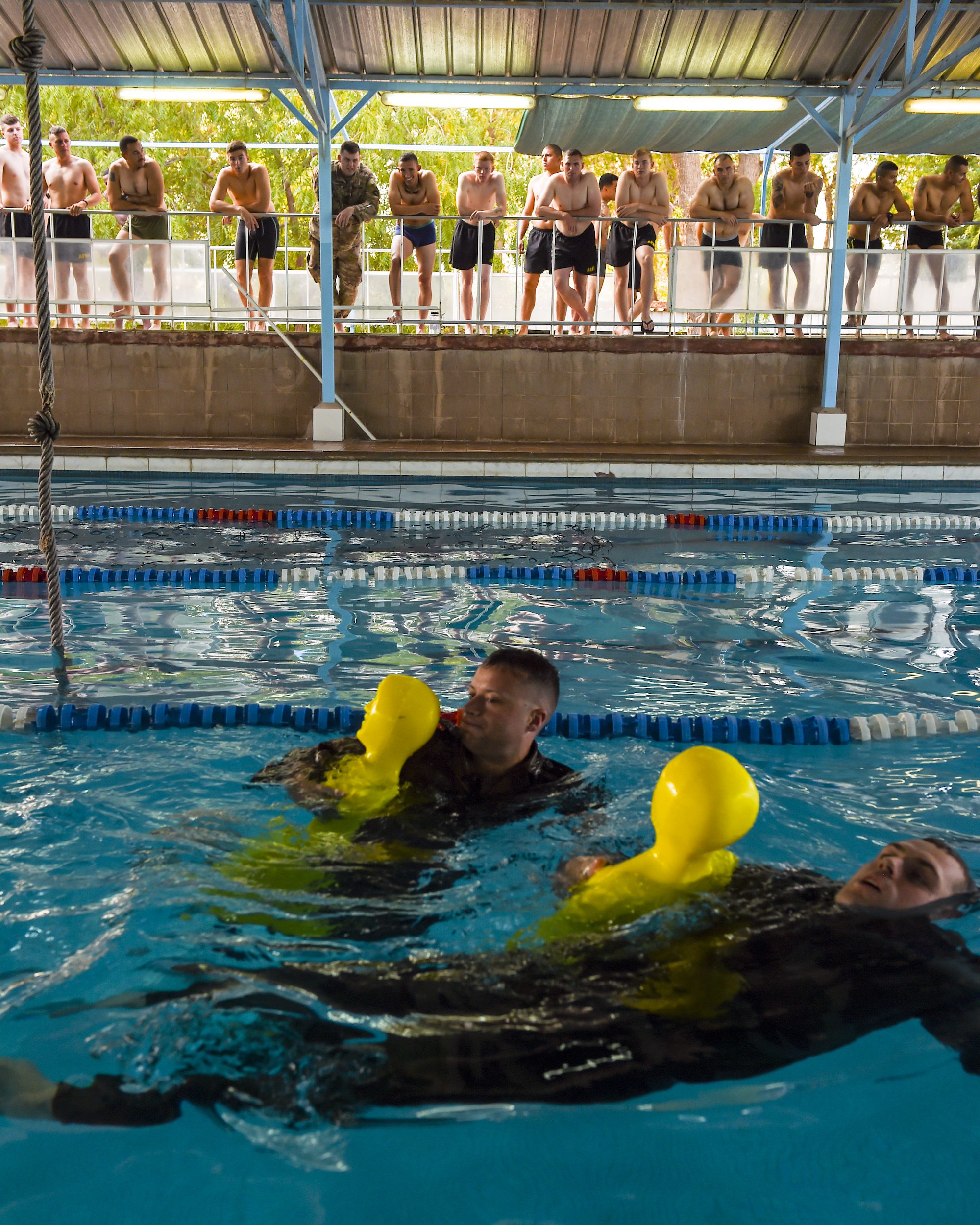 U.S. Army National Guard Soldiers assigned to 3rd Battalion, 144th Infantry Regiment, Task Force Bayonet and French marines assigned to 5th Overseas Interarms Regiment dove into a water-based French Desert Commando Course prequalification assessment.