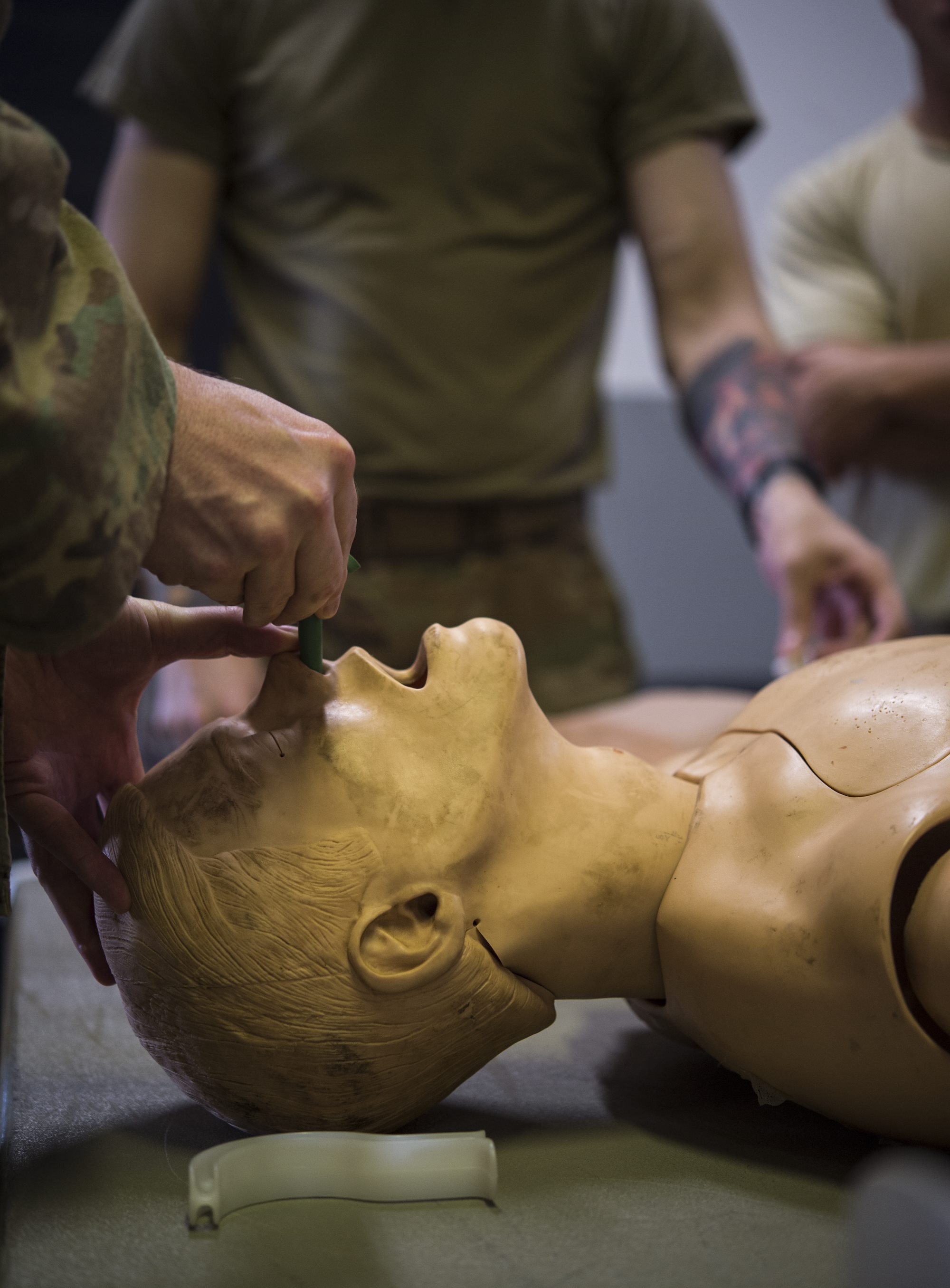 U.S. Army Cpl. Michael Pasichnyk, assigned to the 3rd Battalion, 144th Infantry Regiment Task Force Bayonet, attached to the Combined Joint Task Force – Horn of Africa, demonstrates how to insert a nasopharyngeal airway during a U.S. Army Combat Lifesaver Course held at Camp Lemonnier, Djibouti, Nov. 29, 2017. The five-day course focused on teaching students how to administer lifesaving tactical medical care to wounded service members on the battlefield. (U.S. Air Force photo by Staff Sgt. Timothy Moore)