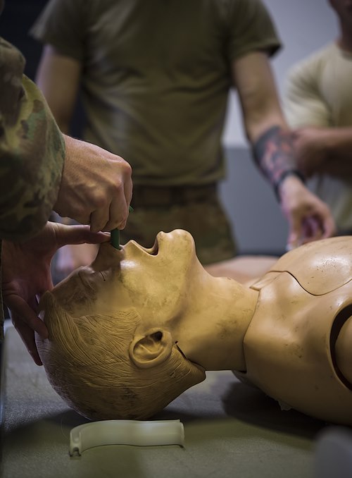 The ability to remain focused and correctly assess wounds to administer aid is an important part of the practical exercise.