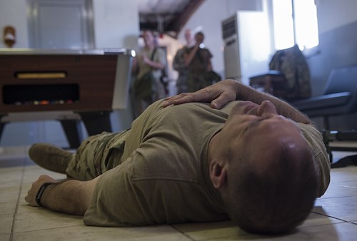 U.S. Army Staff Sgt. Richard Rye, a combat medic assigned to the 443rd Civil Affairs Detachment, attached to the Combined Joint Task Force – Horn of Africa, simulates an injury during the final assessment of a U.S. Army Combat Lifesaver Course held at Camp Lemonnier, Djibouti, Dec. 1, 2017. The five-day course focused on teaching students how to administer lifesaving tactical medical care to wounded service members on the battlefield. (U.S. Air Force photo by Staff Sgt. Timothy Moore)