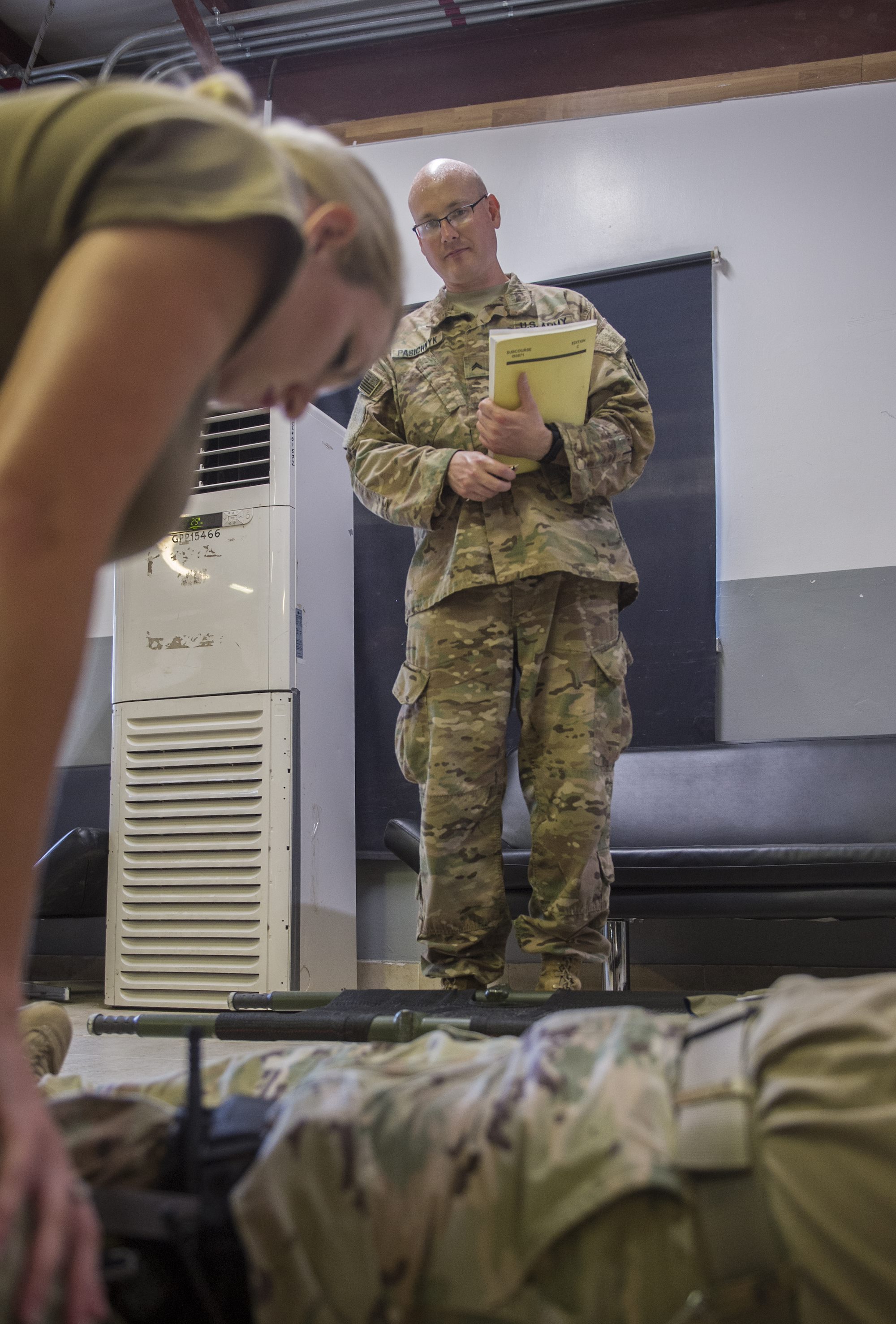U.S. Army Cpl. Michael Pasichnyk, assigned to the 3rd Battalion, 144th Infantry Regiment Task Force Bayonet, attached to the Combined Joint Task Force – Horn of Africa, observes U.S. Navy Utilitiesman 3rd Class Amanda Stone, assigned to Naval Mobile Construction Battalion 133, assess a simulated casualty during a U.S. Army Combat Lifesaver Course held at Camp Lemonnier, Djibouti, Nov. 29, 2017. The five-day course focused on teaching students how to administer lifesaving tactical medical care to wounded service members on the battlefield. (U.S. Air Force photo by Staff Sgt. Timothy Moore)