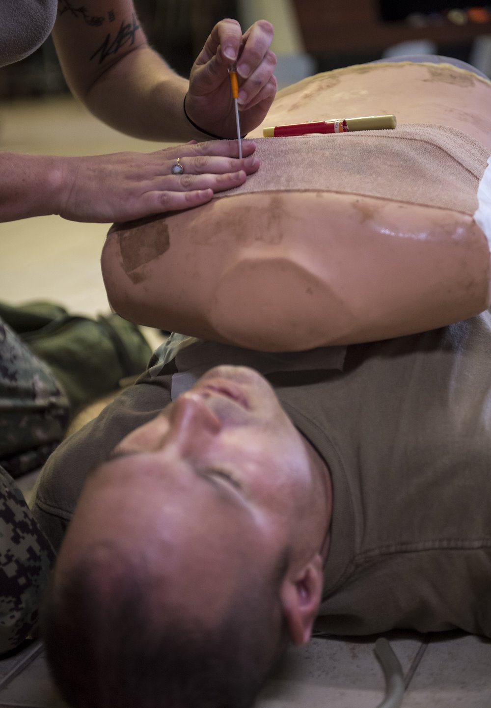 “The most challenging part of the course is really just keeping your head on,” said U.S. Navy Hospital Corpsman 1st Class Ludwig Williams, a radiology technician assigned to the Camp Lemonnier Expeditionary Medical Facility. “(You) look for bleeding, then you go to airway, and circulation in that order opposed to going for airway (first) in the civilian world. You’ve got to stay focused.”