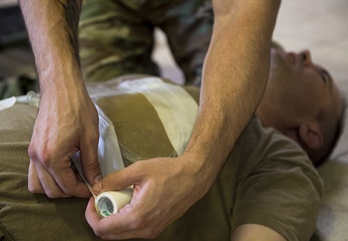 U.S. Air Force Airman 1st Class Antonio Espinoza, assigned to the Combined Joint Task Force - Horn of Africa Communications Directorate, seals the edges of a simulated open chest wound during the final assessment of a U.S. Army Combat Lifesaver Course held at Camp Lemonnier, Djibouti, Dec. 1, 2017. The five-day course focused on teaching students how to administer lifesaving tactical medical care to wounded service members on the battlefield. (U.S. Air Force photo by Staff Sgt. Timothy Moore)