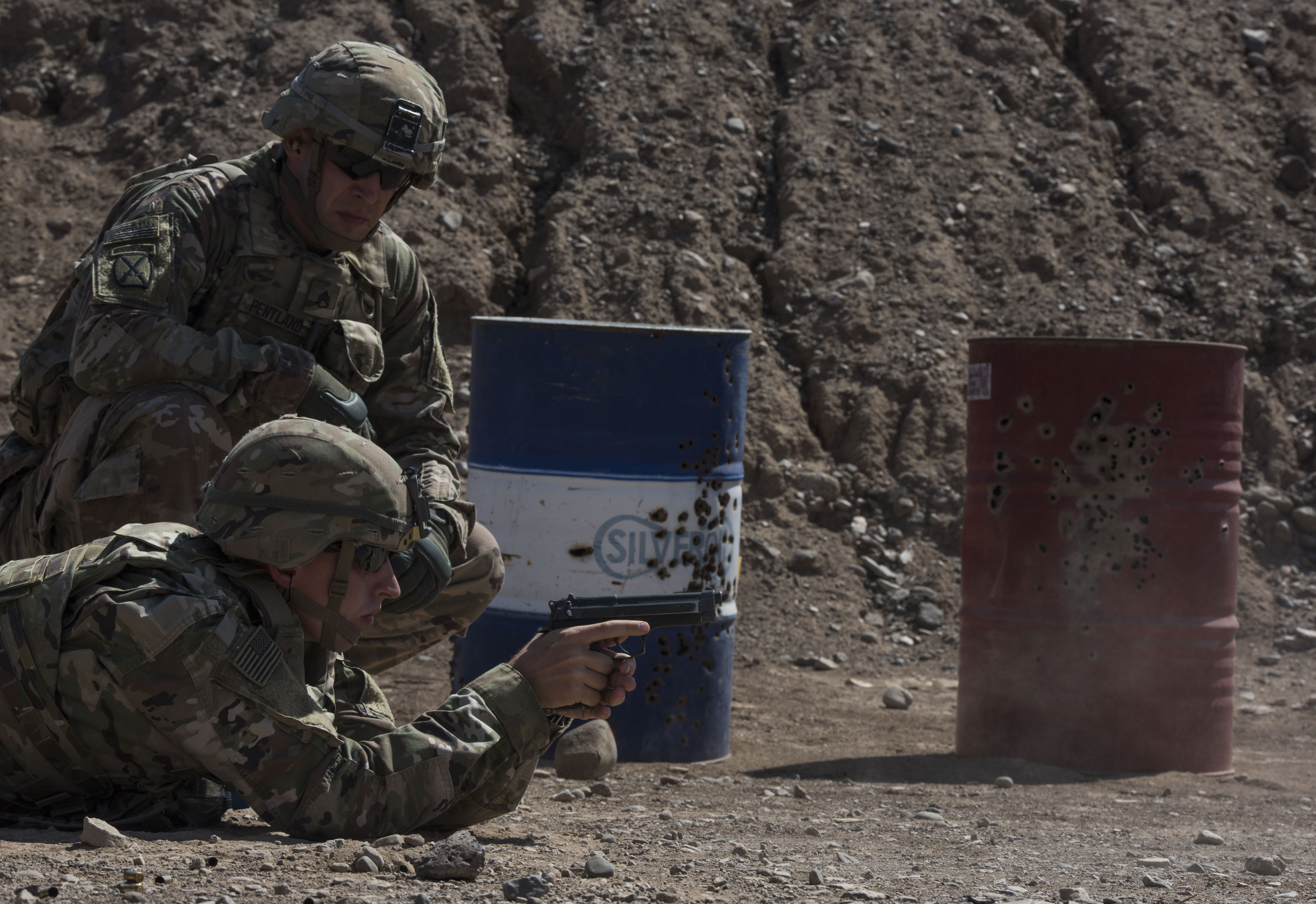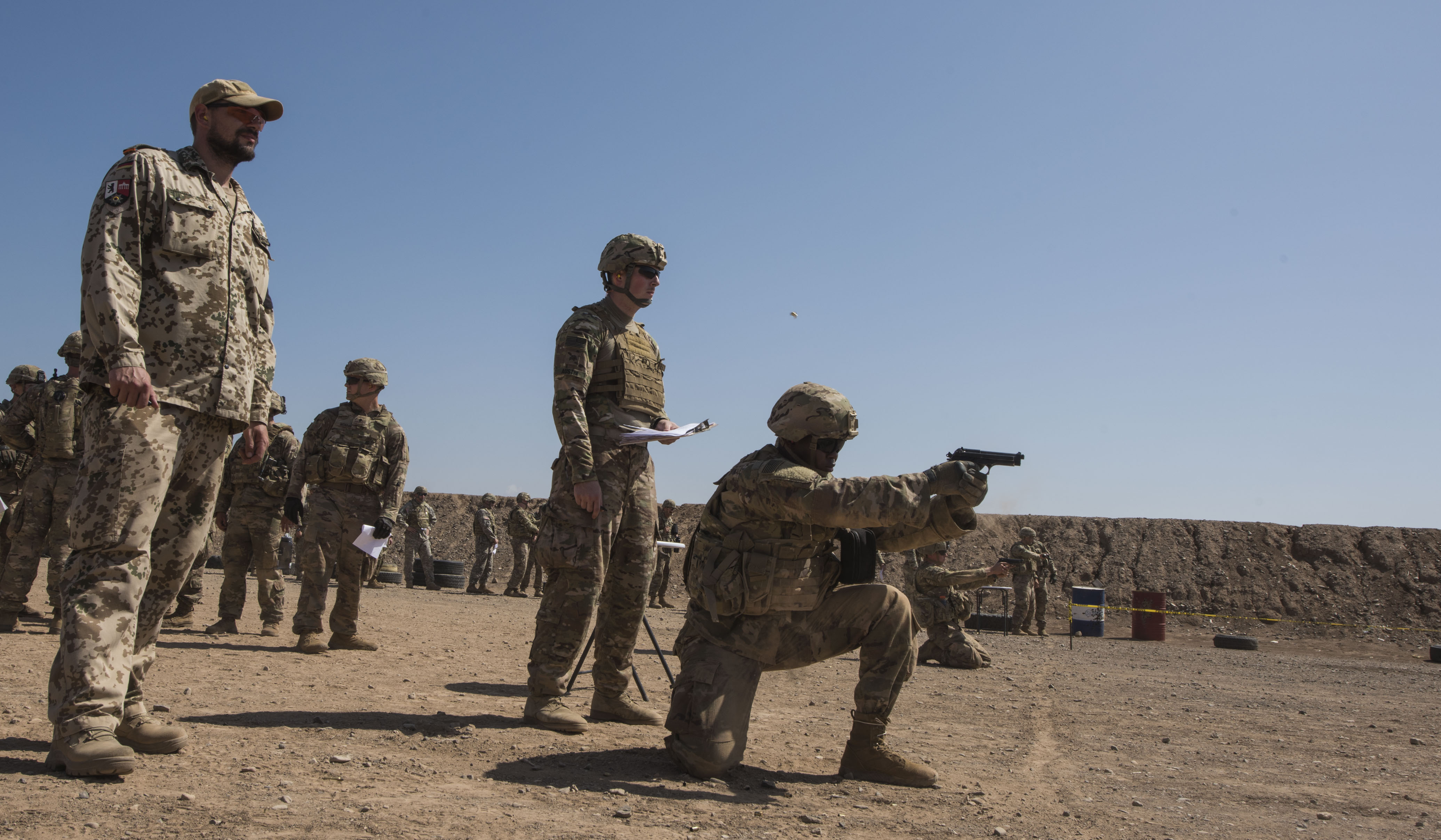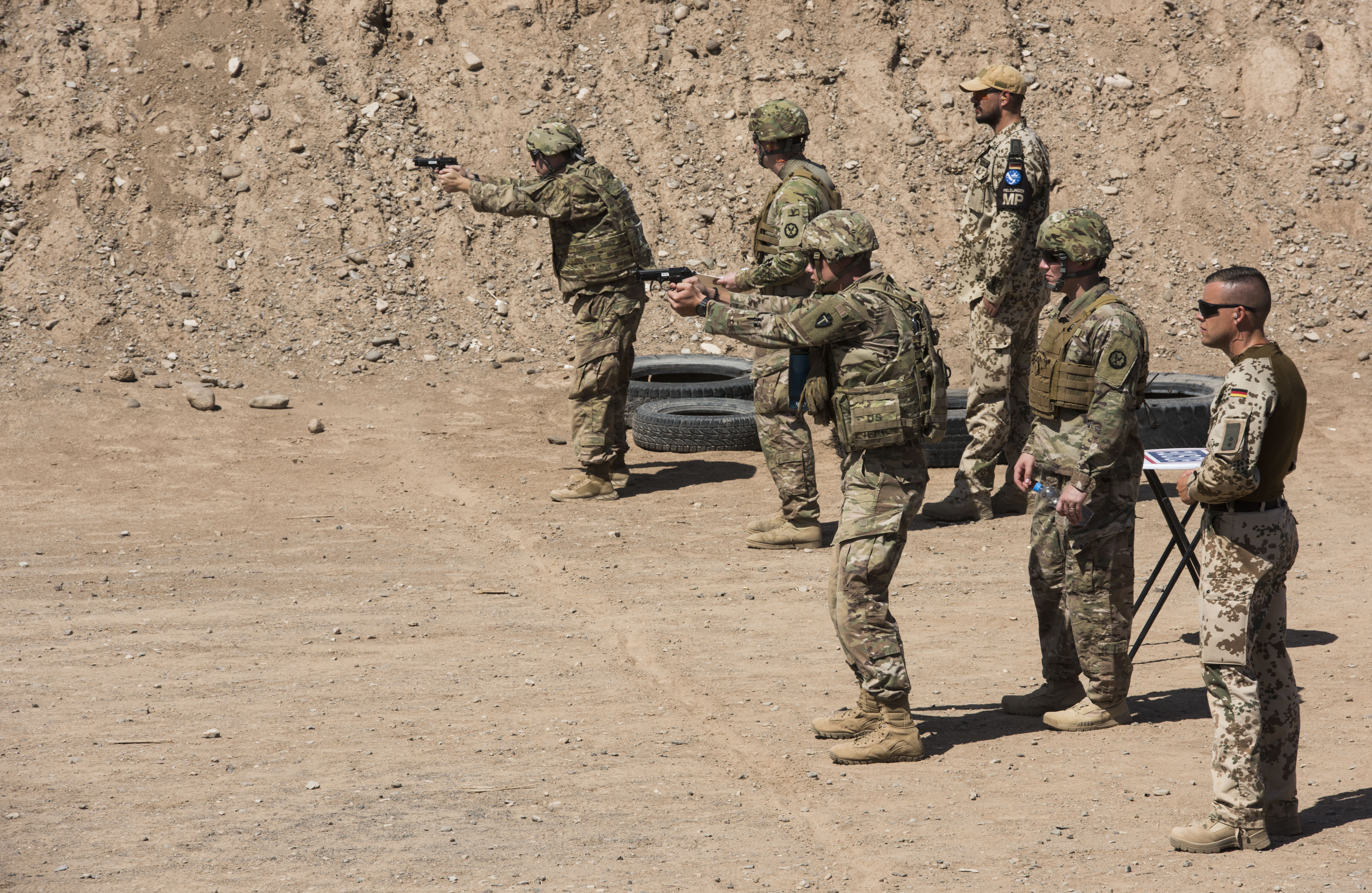 U.S. service members assigned to Combined Joint Task Force-Horn of Africa complete a weapons qualification test as part of the competition to earn the German Armed Forces Proficiency Badge (GAFPB), a decoration of the Armed Forces of the Federal Republic of Germany, at the Djiboutian National Police firing range in Djibouti City, Djibouti, Nov. 29, 2017. Competitors must complete a physical fitness test, uniformed swim, weapons qualification, ruck march, first aid course and chemical warfare course to be awarded the GAFPB, one of the few foreign allied military awards that U.S. service members are authorized to wear. (U.S. Air National Guard photo by Staff Sgt. Allyson L. Manners)