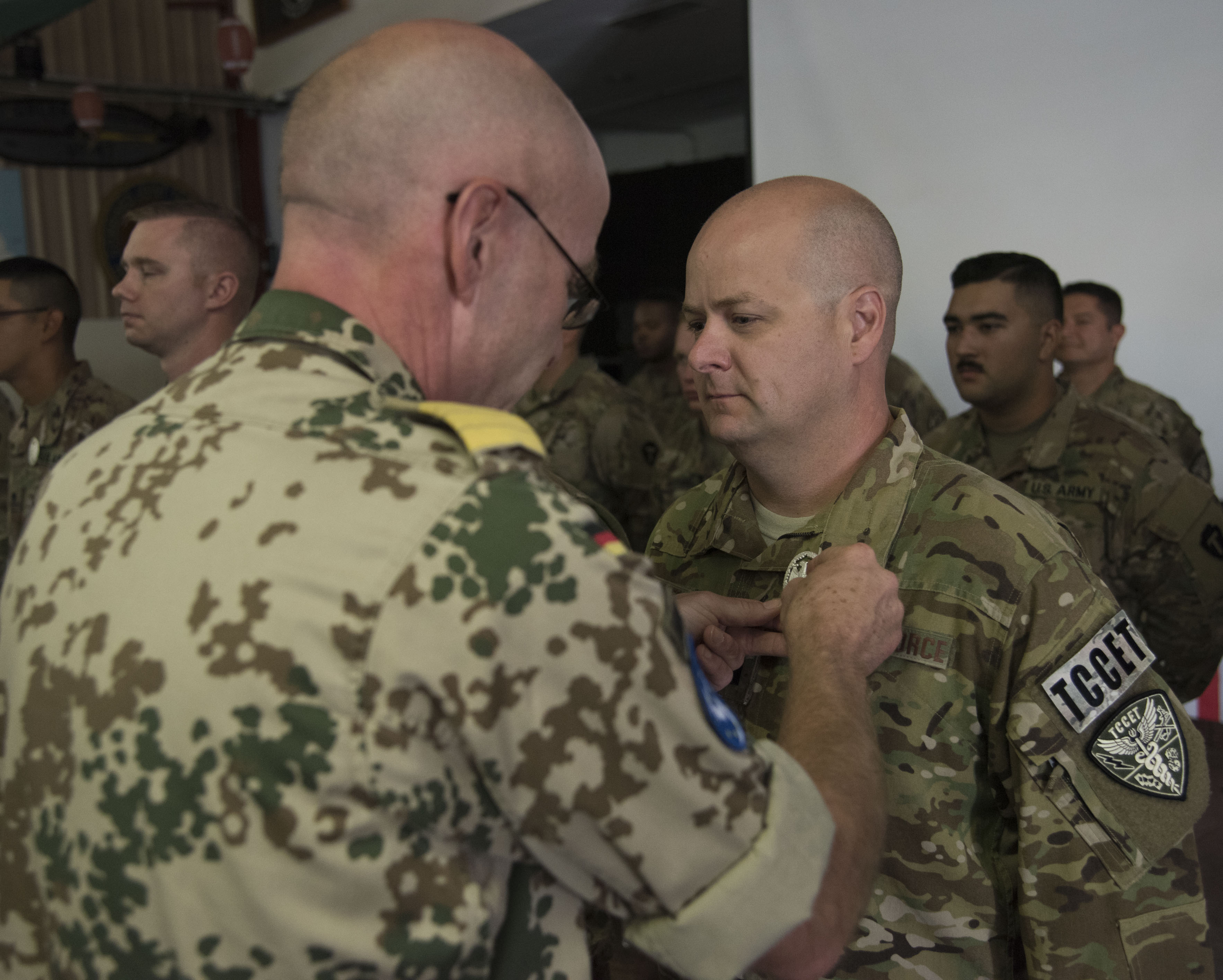 A U.S. Air Force Airman assigned to Combined Joint Task Force-Horn of Africa receives the German Armed Forces Proficiency Badge (GAFPB), a decoration of the Armed Forces of the Federal Republic of Germany, by German commander Axel Schilling at Camp Lemonnier, Djibouti, Dec. 8, 2017. Competitors completed a physical fitness test, uniformed swim, weapons qualification, ruck march, first aid course and chemical warfare course to be awarded the GAFPB, one of the few foreign allied military awards that U.S. service members are authorized to wear. (U.S. Air National Guard photo by Staff Sgt. Allyson L. Manners)
