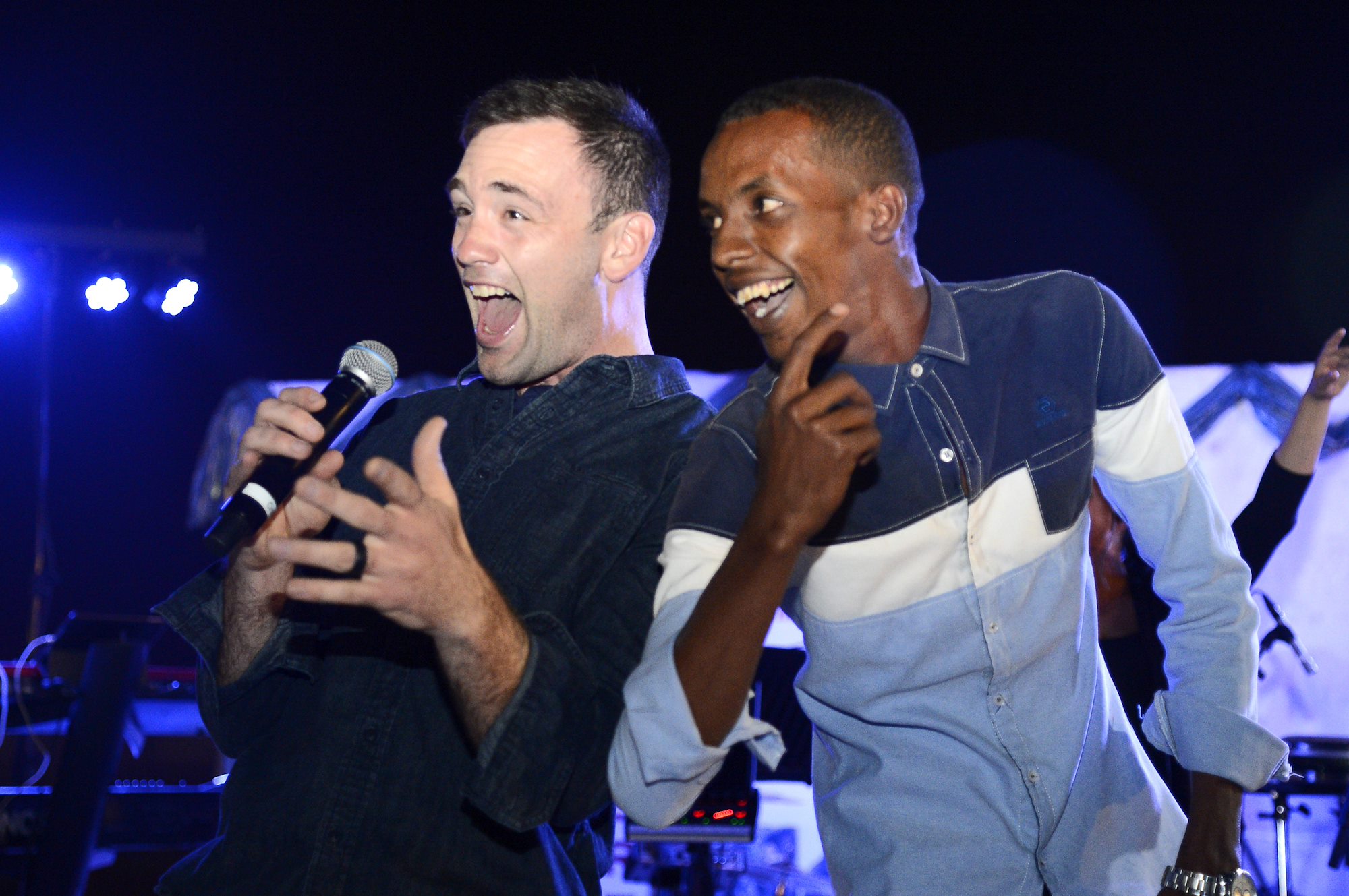 U.S. Air Force Staff Sgt. Craig Larimer, a member of the Air Forces Central Command (AFCENT) Band, sings and connects with a Djiboutian local during a concert at the Balbala E-Learning Center in Djibouti, January 10, 2018. The AFCENT Band performed at the E-Learning center as part of their two week tour where they held workshops, clinics, and concerts throughout the city of Djibouti. (U.S. Navy Photo by Mass Communication Specialist 2nd Class Timothy M. Ahearn)