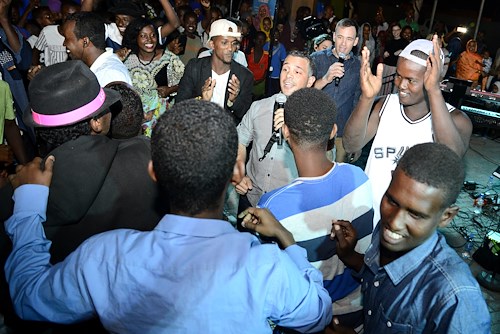 U.S. Air Force Staff Sgt. Lencys Estaban Nunez, a member of the Air Forces Central Command (AFCENT) Band, sings lead vocals to “Despacito” while U.S. Air Force Staff Sgt. Craig Larimer sings backup to an enthusiastic crowd at the Balbala E-Learning Center in Djibouti, January 10, 2018. The AFCENT Band performed at the E-Learning center as part of their two week tour where they held workshops, clinics, and concerts throughout the city of Djibouti. (U.S. Navy Photo by Mass Communication Specialist 2nd Class Timothy M. Ahearn)