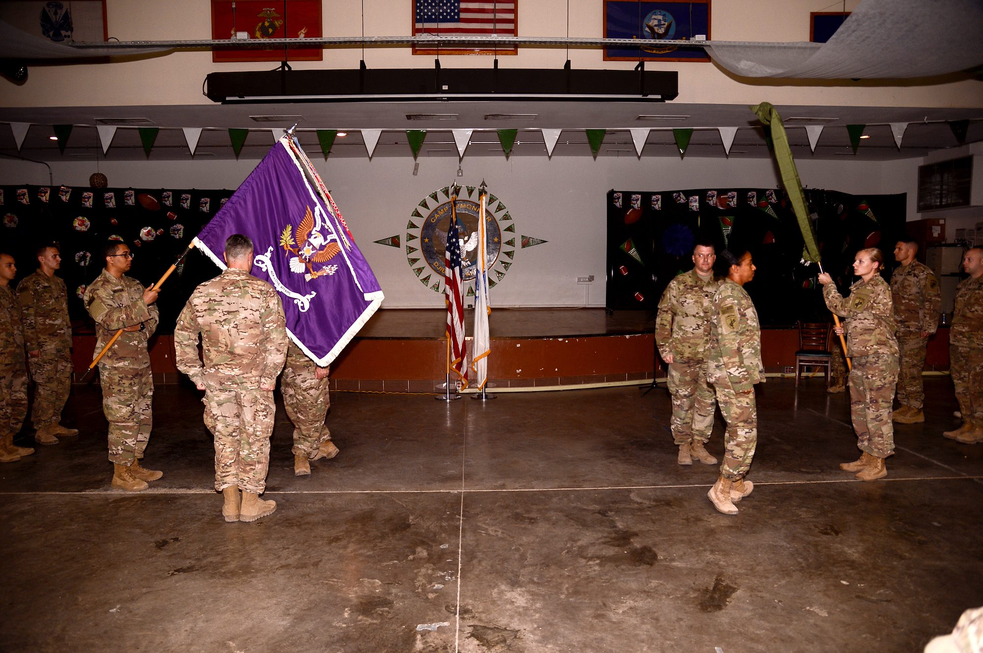 As the two units stood in formations across from one another, the 443rd retired their unit colors while the 404th raised theirs, and U.S. Army Lt. Col. Stefan Adamcik assumed command of the mission from U.S. Army Lt. Col. Keith McGee.